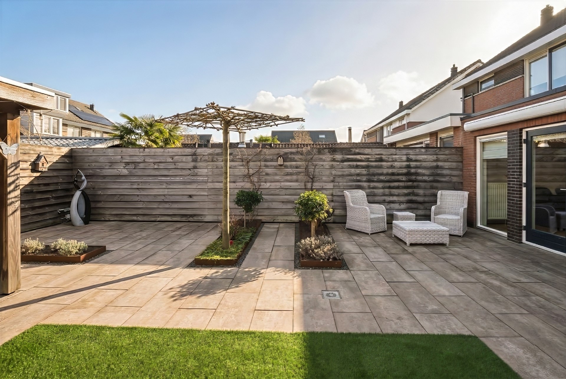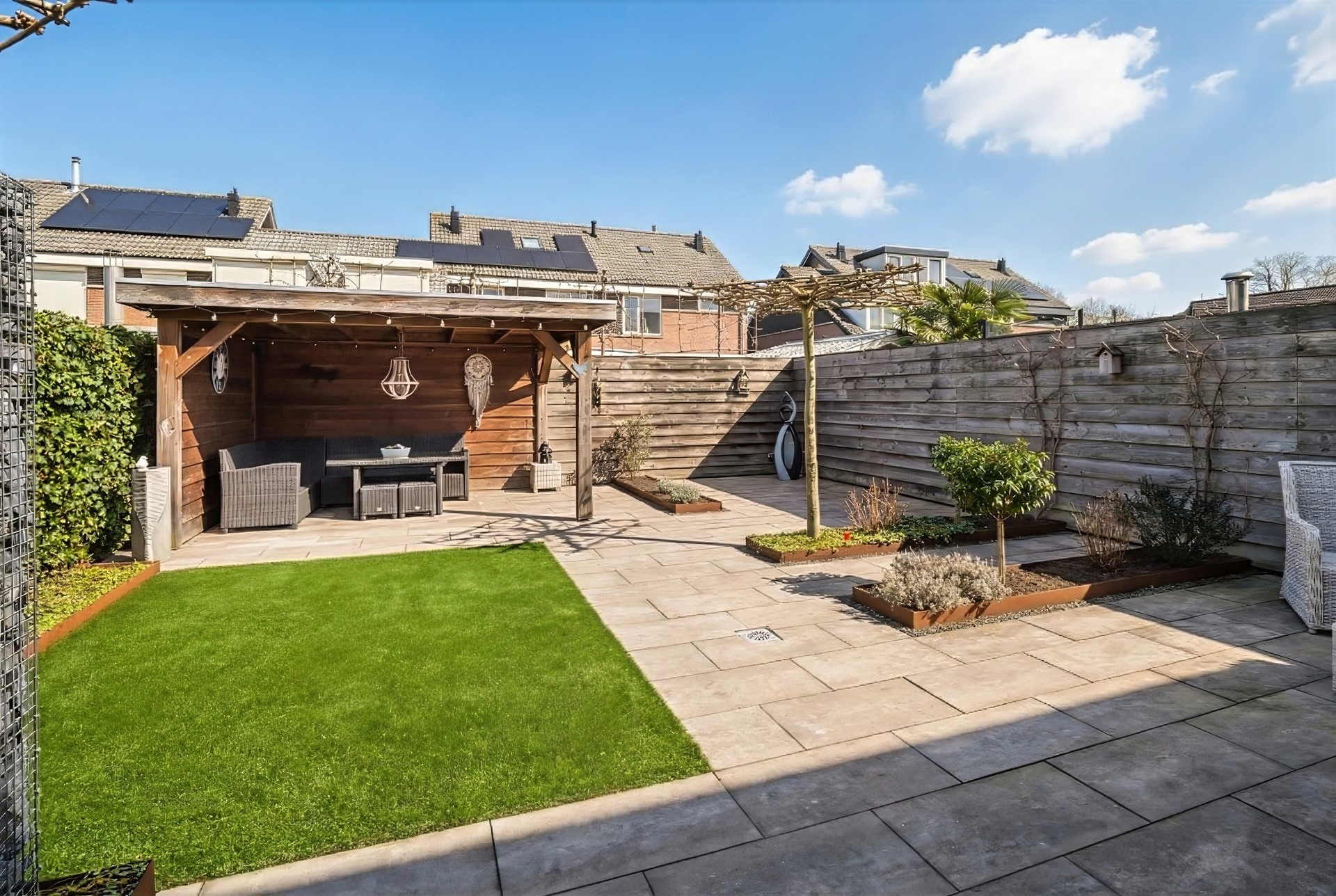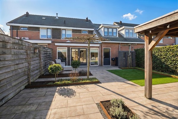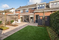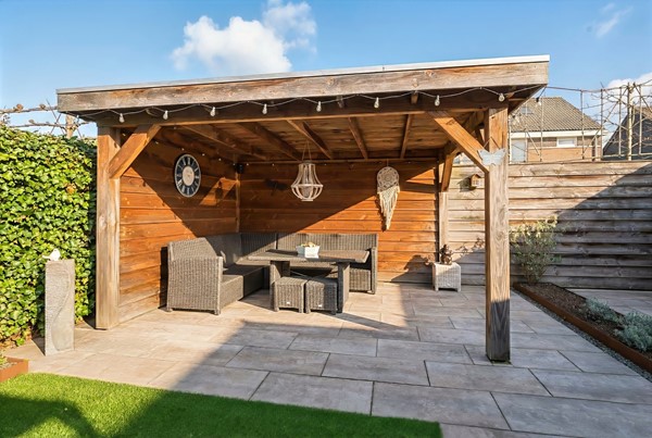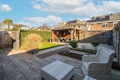 Achter het huis ligt een heerlijke loungetuin; perfect voor wie wil genieten van het buitenleven zonder zich zorgen te maken over het onderhoud. Op de terrassen kun je fijn vertoeven en het elektrische zonnescherm biedt schaduw wanneer gewenst. Onder de houten veranda kan je tot in de late uurtjes genieten en staat je tuinmeubilair altijd droog. Zowel onder de veranda als rechts achterin de tuin zijn stopcontacten aanwezig. Het kunstgras zorgt voor een frisgroen vlak en de strak vormgegeven borders met Corte stalen randen zijn gevuld met bodembedekkers en een gevarieerde beplanting. In drie borders is een mantelbuis aanwezig, zodat de aanleg van tuinverlichting eenvoudig te realiseren is; zo tover je deze tuin om tot een charmante verlichte plek. Praktisch is de buitenkraan tegen de achtergevel en het waterpunt rechts achterin de tuin. De afscheiding van steenkorven maakt dat de containers netjes uit het zicht geplaatst kunnen worden. Privacy is tenslotte gewaarborgd door de houten erfafscheiding en de met hedera begroeide schermen.