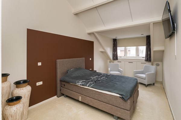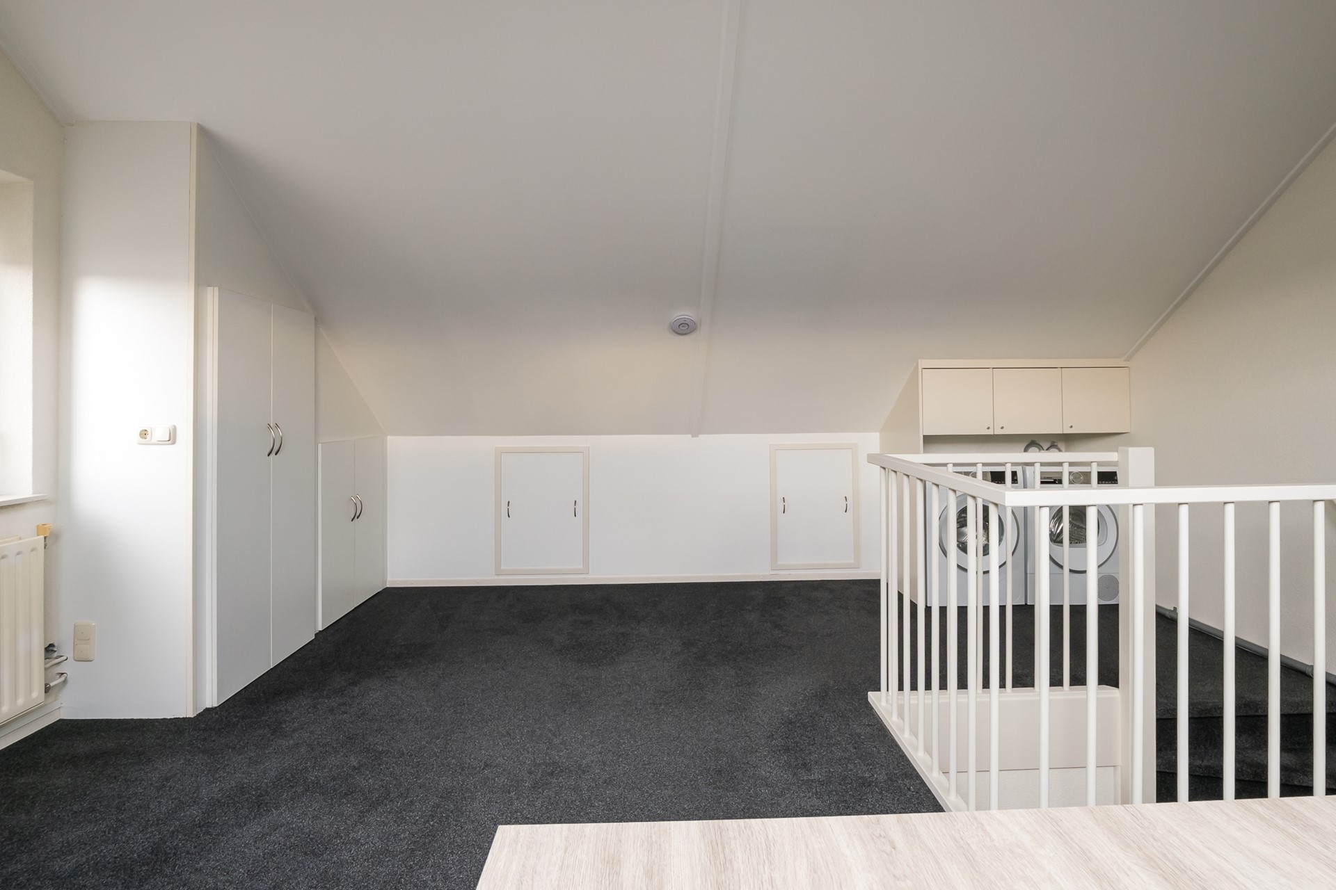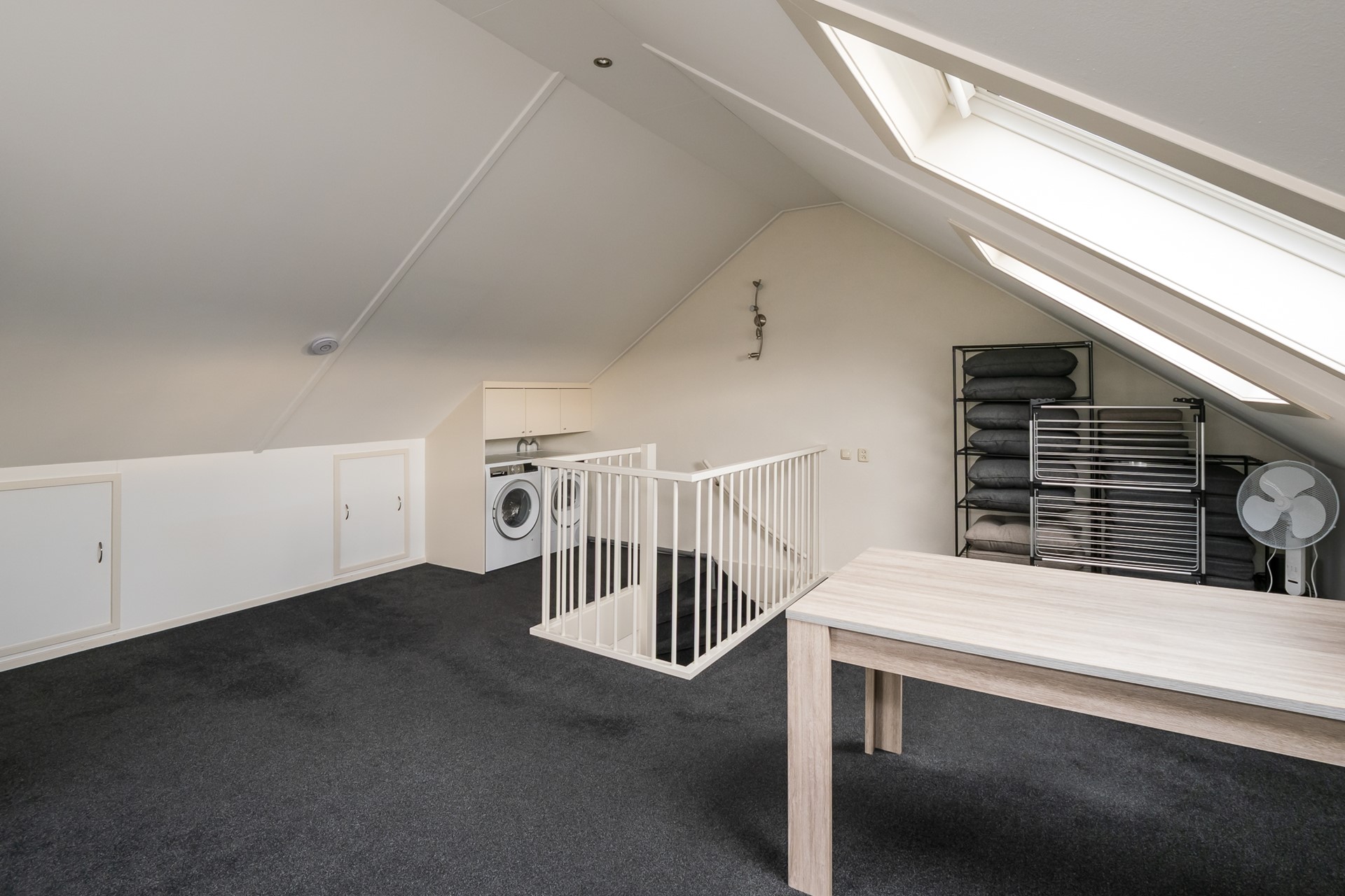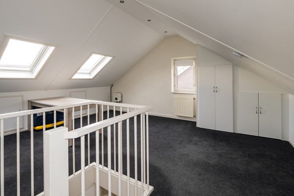 De zolderverdieping voelt dankzij het royale vloeroppervlak en de smaakvolle afwerking als een prettige volwaardige woonlaag. In 2024 werd nog een nieuw tapijt gelegd en in 2021 kregen de wanden een nieuwe finish. Het raam in de zijgevel en de 2 kunststof Velux-vensters zorgen voor een heldere en aangename lichtinval. De radiator verzorgt de verwarming. Direct bovenaan de trapopgang bevindt zich een maatwerk wasmeubel, met onderin ruimte voor de wasmachine en droger en bovenin praktische kastruimten. Ook de CV-ketel en de box van de mechanische ventilatie zijn keurig weggewerkt in een strak vormgegeven kast. Aan weerszijden van de verdieping zijn bergruimtes achter de knieschotten aanwezig. Dankzij het royale vloeroppervlak behoort het creëren van een 5de (slaap-)kamer zeker tot de mogelijkheden.
