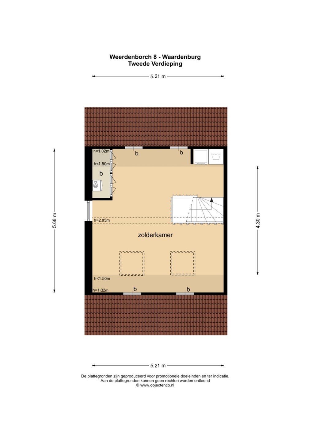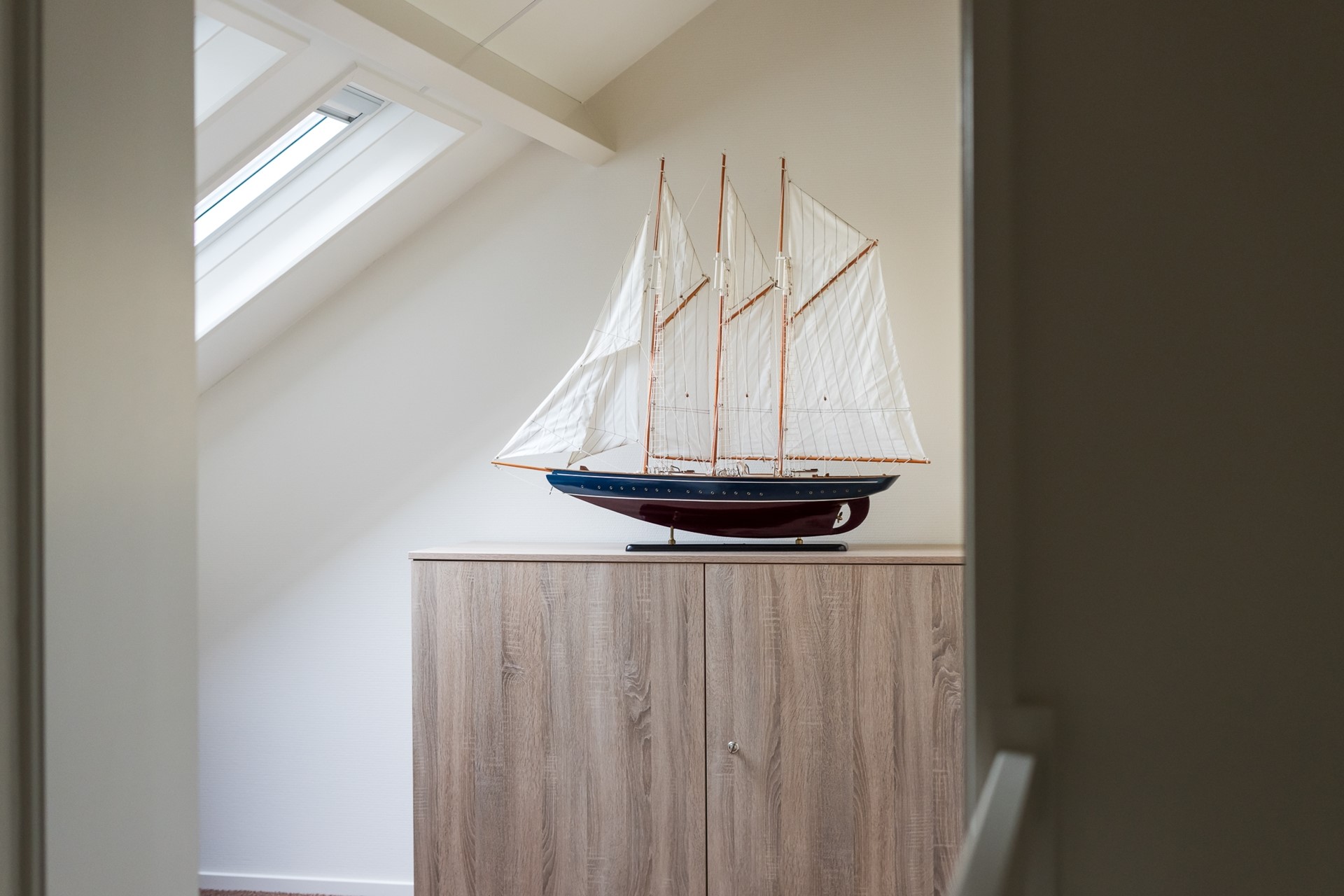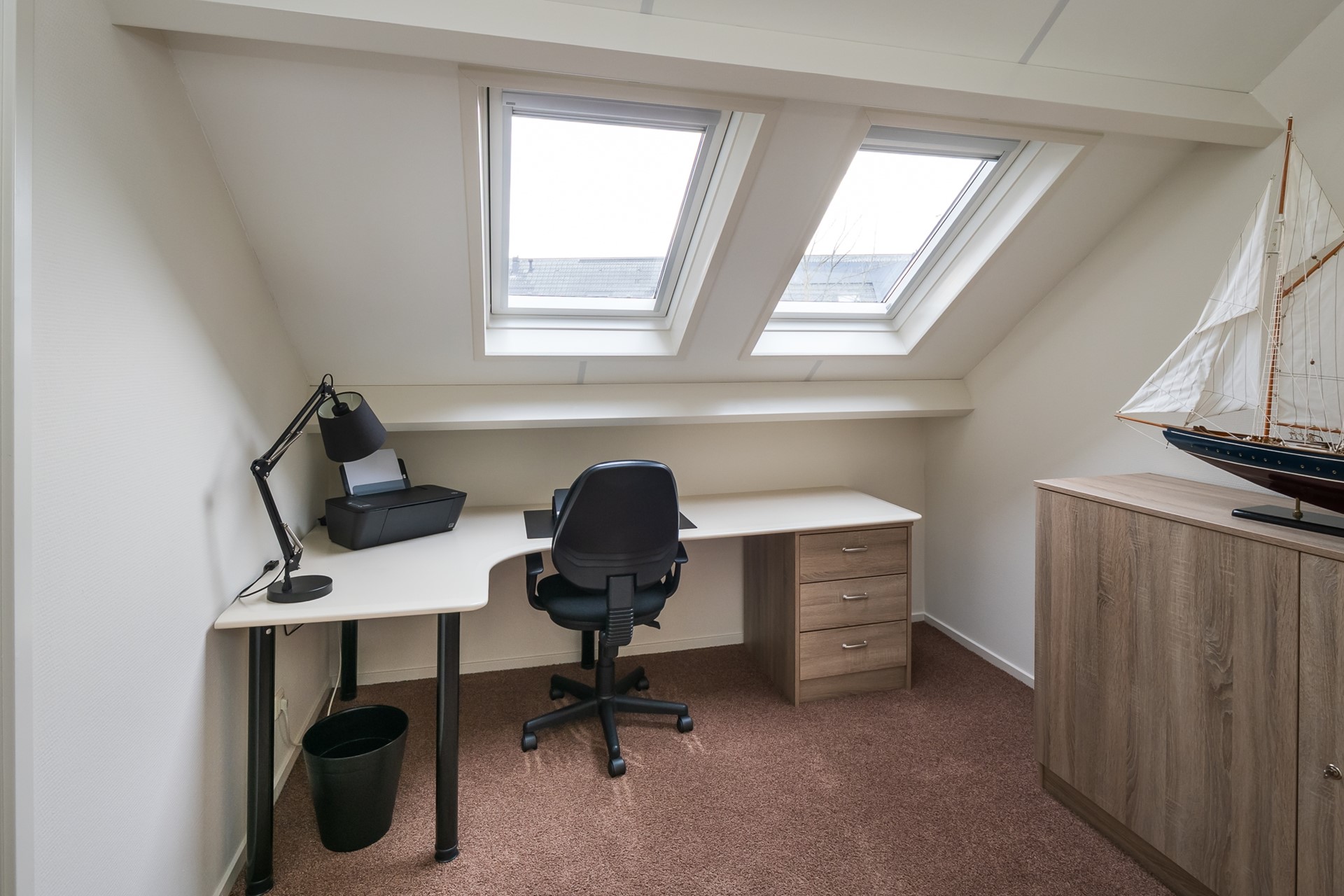De zolderverdieping voelt dankzij het royale vloeroppervlak en de smaakvolle afwerking als een prettige volwaardige woonlaag. In 2024 werd nog een nieuw tapijt gelegd en in 2021 kregen de wanden een nieuwe finish. Het raam in de zijgevel en de 2 kunststof Velux-vensters zorgen voor een heldere en aangename lichtinval. De radiator verzorgt de verwarming. Direct bovenaan de trapopgang bevindt zich een maatwerk wasmeubel, met onderin ruimte voor de wasmachine en droger en bovenin praktische kastruimten. Ook de CV-ketel en de box van de mechanische ventilatie zijn keurig weggewerkt in een strak vormgegeven kast. Aan weerszijden van de verdieping zijn bergruimtes achter de knieschotten aanwezig. Dankzij het royale vloeroppervlak behoort het creëren van een 5de (slaap-)kamer zeker tot de mogelijkheden.