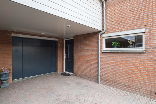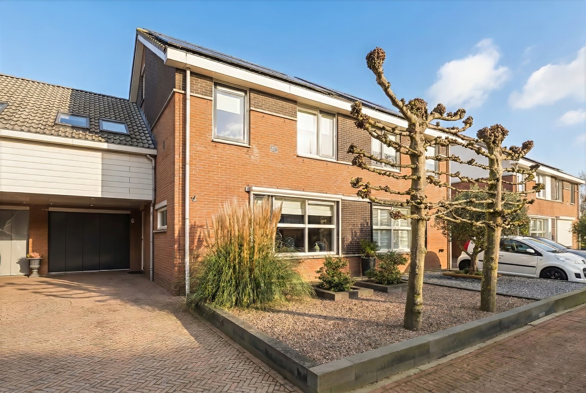 De voortuin versterkt het karakter van het huis en is onderhoudsvriendelijk ingericht met siergrind, pampasgras en 2 volwassen leilinden. De oprit van klinkerbestrating biedt ruimte aan 2 auto’s. Dankzij de royale luifel voor de garage en de verlichting met sensor kun je de voordeur altijd droog bereiken en springt de verlichting automatisch aan.