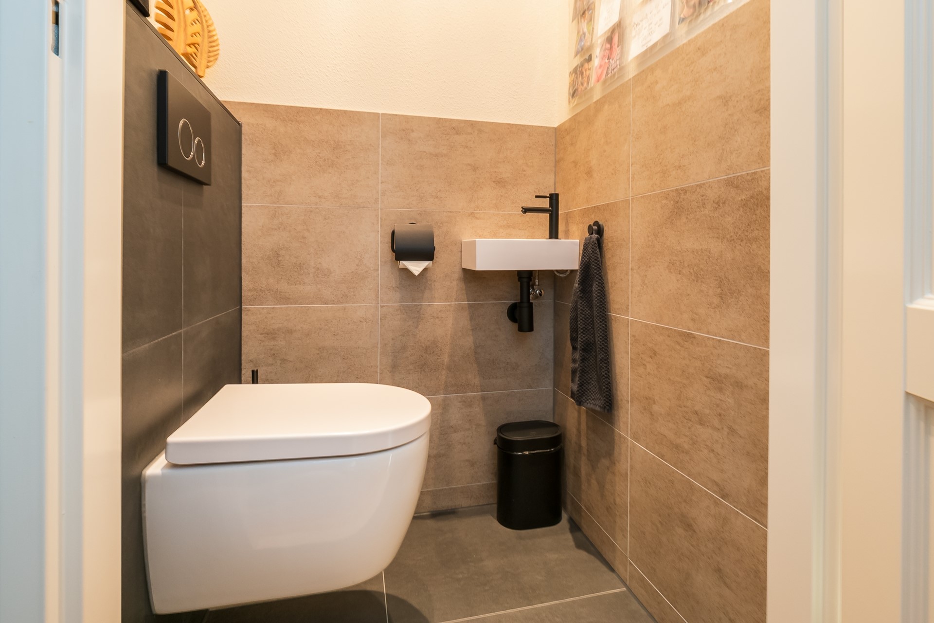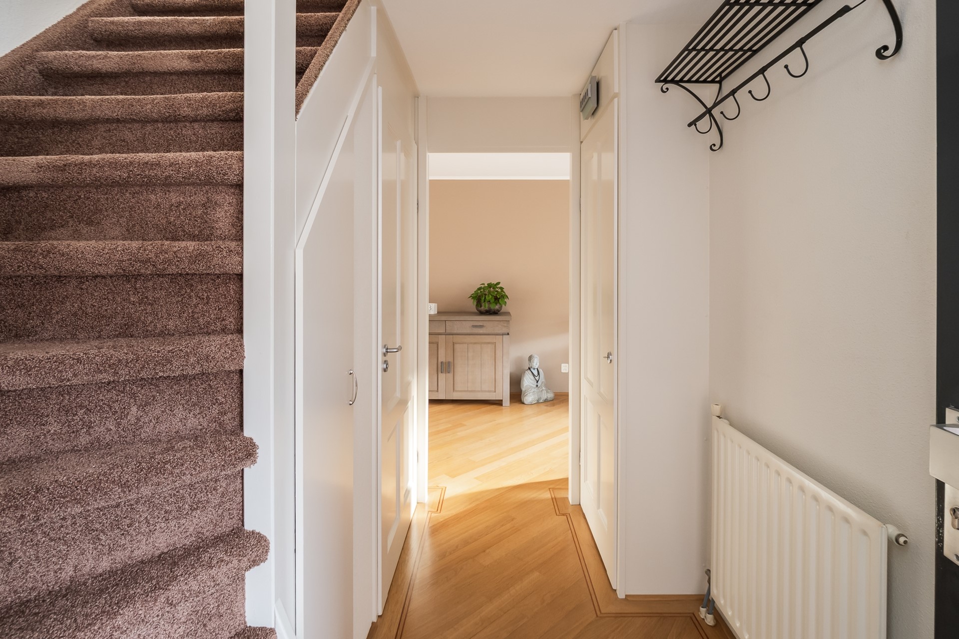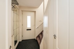 Via de oprit bereik je de entree aan de linkerzijde van de woning. Het dakoverstek met inbouwspots zorgt ervoor dat je altijd droog binnenkomt. De moderne voordeur geeft toegang tot de stijlvolle ontvangsthal, die direct een visitekaartje afgeeft voor de rest van de woning. De eiken parketvloer met ingelegde bies, de strakke finish van wanden en plafond en de paneeldeuren springen meteen in het oog. Deze stijlvolle afwerking ademt door op de gehele begane grond, wat zorgt voor rust en eenheid. In de hal bevinden zich de trapopgang, trapkast, meterkast en de toiletruimte. Deze toiletruimte is in 2025 gemoderniseerd en voorziet in een wandcloset, fontein en mechanische ventilatie.