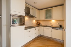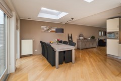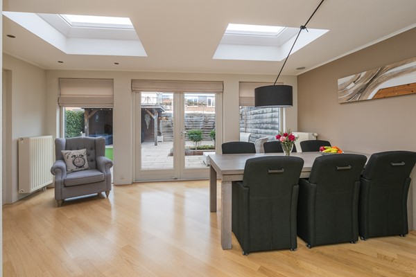 Aan de tuinzijde is de woning maar liefst 3 meter uitgebouwd, waardoor een geweldige woonkeuken ontstaan. Hier is ruimte om een flinke eettafel te plaatsen én bijvoorbeeld een extra speel- of loungeplek te creëren. Ook het lichtplan is zorgvuldig uitgewerkt, met een centraal lichtpunt en diverse inbouwspots. Grote ramen, openslaande deuren en twee lichtkoepels zorgen voor een optimale daglichttoetreding en een heerlijke verbondenheid met de tuin. Met het elektrisch bedienbare zonnescherm aan de achtergevel en de hoezen voor de lichtkoepels is de lichtinval eenvoudig te temperen. De keukenopstelling is gedateerd en uitgevoerd met een keramische kookplaat, rvs afzuigschouw, combimagnetron, koelkast, vaatwasmachine en veel kastruimte.