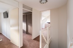 Via de gestoffeerde trap bereik je de royale overloop van de eerste verdieping. Door de opbouw op de garage is hier veel extra ruimte ontstaan en beschik je over maar liefst 4 slaapkamers, allen bereikbaar vanaf de centrale overloop. Op de vloer ligt kwalitatief tapijt en de wanden, plafonds en dakvlakken hebben een lichte en strakke finish.