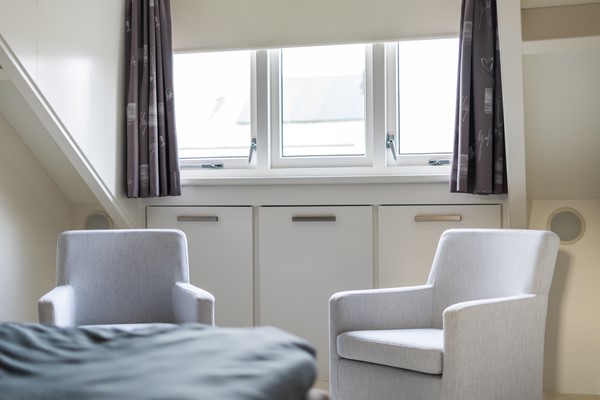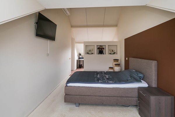 De 1ste slaapkamer boven de garage voelt als een luxe, veelzijdige ruimte. Doordat de kamer is opengelaten tot in de dakpunt wordt het ruimtelijk effect nogmaals versterkt. Door middel van een roomdivider is de kamer opgedeeld in een werk- en slaapgedeelte. Allereerst bereik je de werkkamer; waar je onder de 2 kunststof Velux-vensters een fijne lichte werkplek kunt creëren. Uiteraard zijn ook andere gebruiksmogelijkheden denkbaar, zoals een loungehoek of inloopkast. Het slaapkamerdeel is, mede door de aanwezige dakkapel, bijzonder ruim van afmeting. Je kunt hier dan ook een flink slaapmeubel plaatsen. Leuk detail zijn de drie nissen in de roomdivider, die naar smaak zijn in te richten met woonaccessoires. De dimbare inbouwspots zorgen voor een sfeervolle verlichting en het klimaat is altijd aangenaam dankzij de “Mitsubishi” airconditioner van 2024 die kan koelen en verwarmen. Deze airconditioner heeft voldoende capaciteit om de gehele slaapverdieping te voorzien van een aangenaam klimaat. Bediening kan via een afstandsbediening en een app op je smartphone.