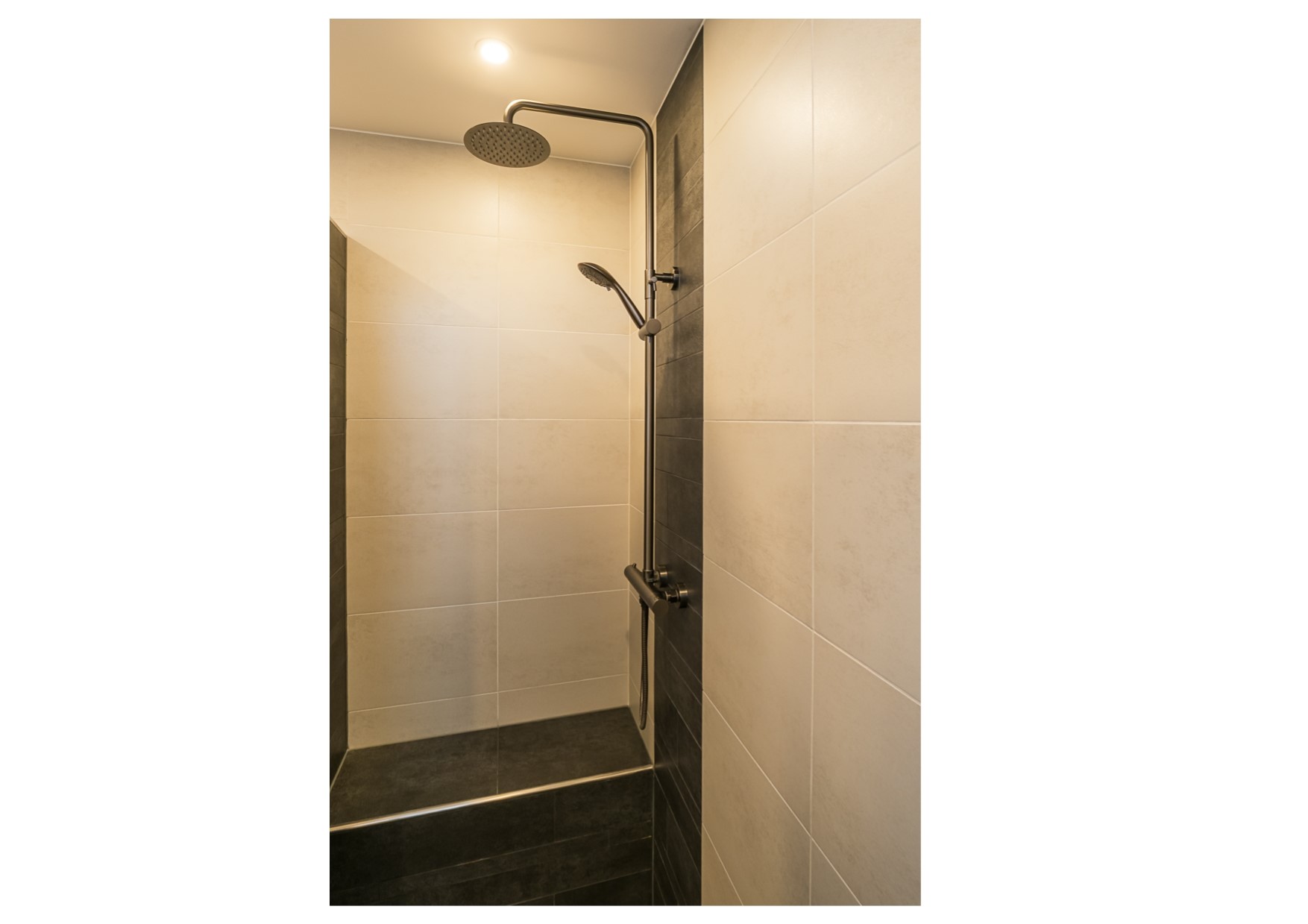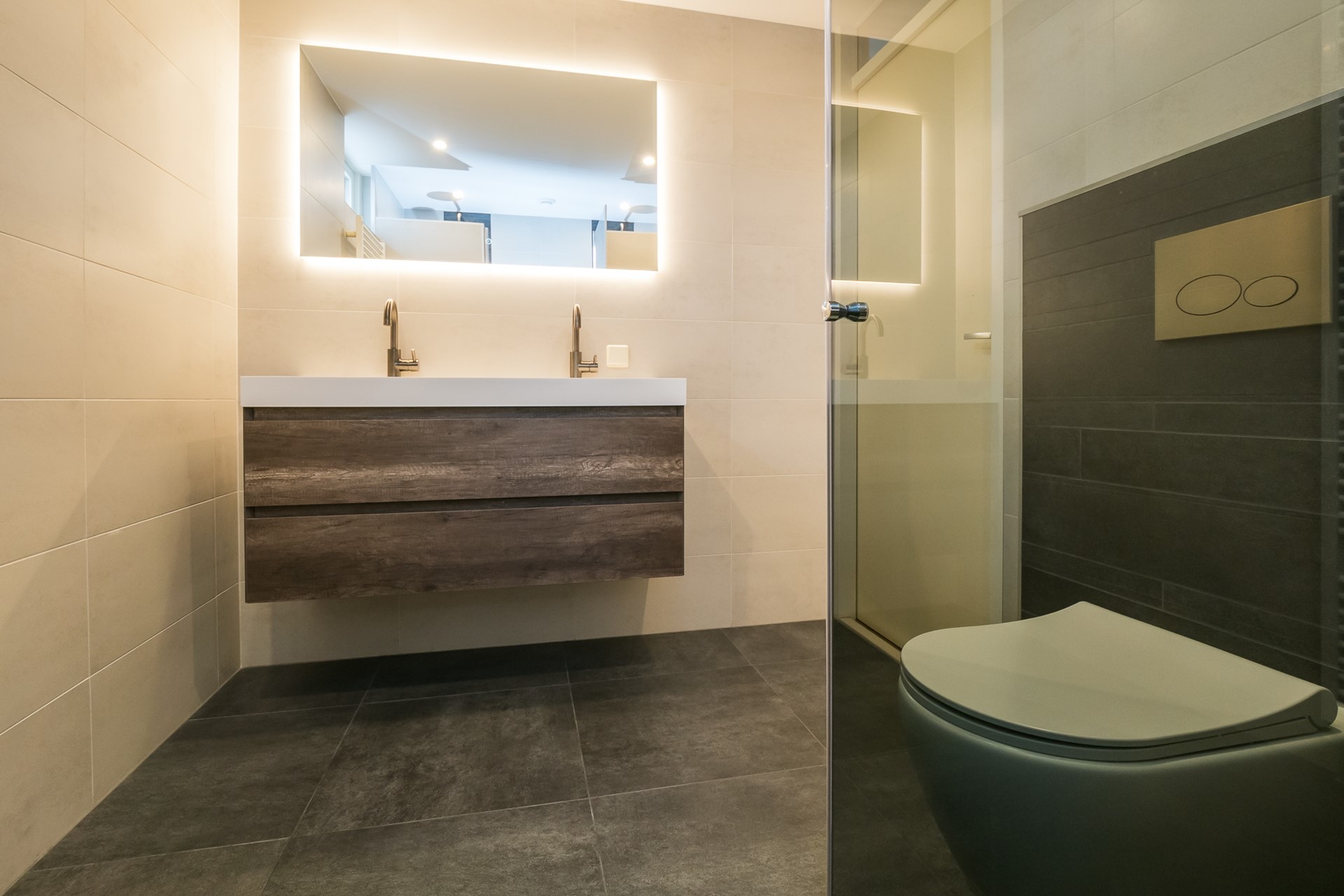 De badkamer is in 2023 volledig nieuw geïnstalleerd en ademt comfort. De duo-douche met met regen- en handdouches maakt douchen tot een échte beleving voor samen. Het duo-wastafelmeubel met ladekasten, moderne kranen en spiegel met led-verlichting en spiegelverwarming is zowel praktisch als elegant. Alle kranen in deze badkamer zijn uitgevoerd in gunmetal. Het wandcloset maakt de sanitaire inrichting compleet. De inbouwspots in het gladde stucwerk plafond zorgen voor een aangename en gelijkmatige verlichting. Daarnaast dragen de designradiator, de mechanische ventilatie (met sensor) en het uitzetraam bij aan een comfortabele temperatuur en een frisse atmosfeer.