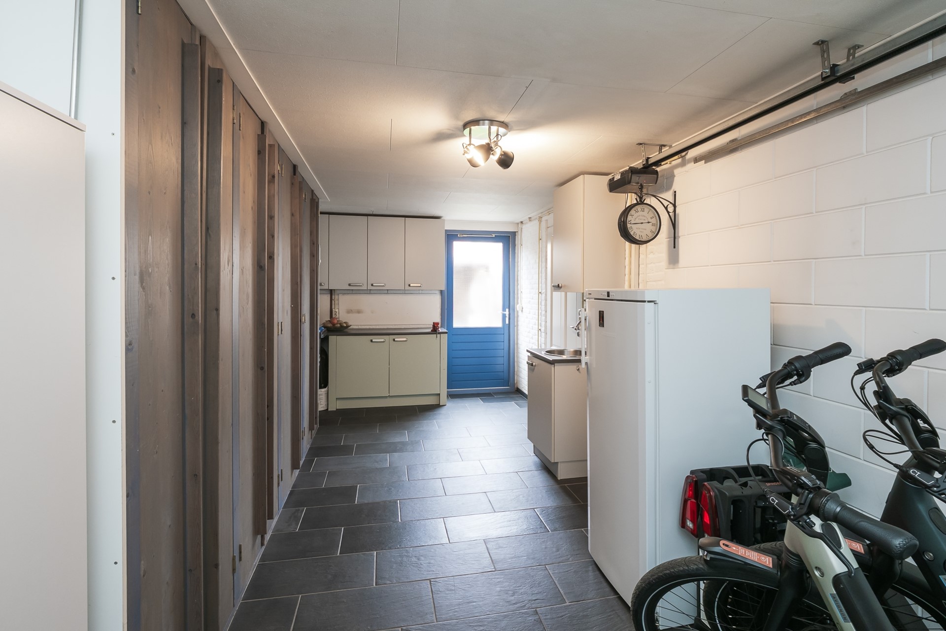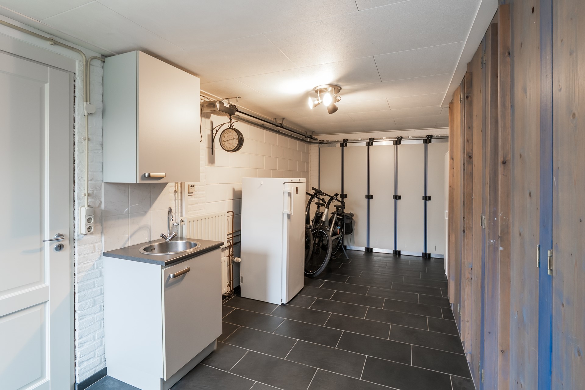 Vanuit de woonkeuken is de inpandige garage toegankelijk; een praktisch verlengstuk van je huis. De ruimte is zorgvuldig afgewerkt met plavuizen in leisteenlook, witte stenen wanden en een strak systeemplafond. De radiatoren met thermostaatknop verzorgen de verwarming. Aan bergruimte is geen gebrek: er is een royale vaste kastenwand én een extra keukenopstelling in twee delen met spoelbak en warm en koud stromend water. Aan de opritzijde bevindt zich een elektrisch bedienbare sectionaaldeur die langs de wand opent, terwijl een loopdeur in de achtergevel direct toegang geeft tot de achtertuin. Kortom, een gebruiksvriendelijk geheel.