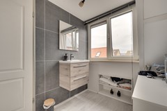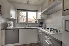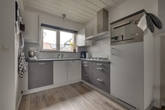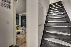 Begane grond, hal met meterkast en trap naar de eerste verdieping. Woonkamer met open keuken met vaste trap/kelderkast. Achter de keuken, ruime bijkeuken met keukenblok, toilet, vaste inbouwkast en ruime badkamer met douche, wastafel, designradiator en ligbad.