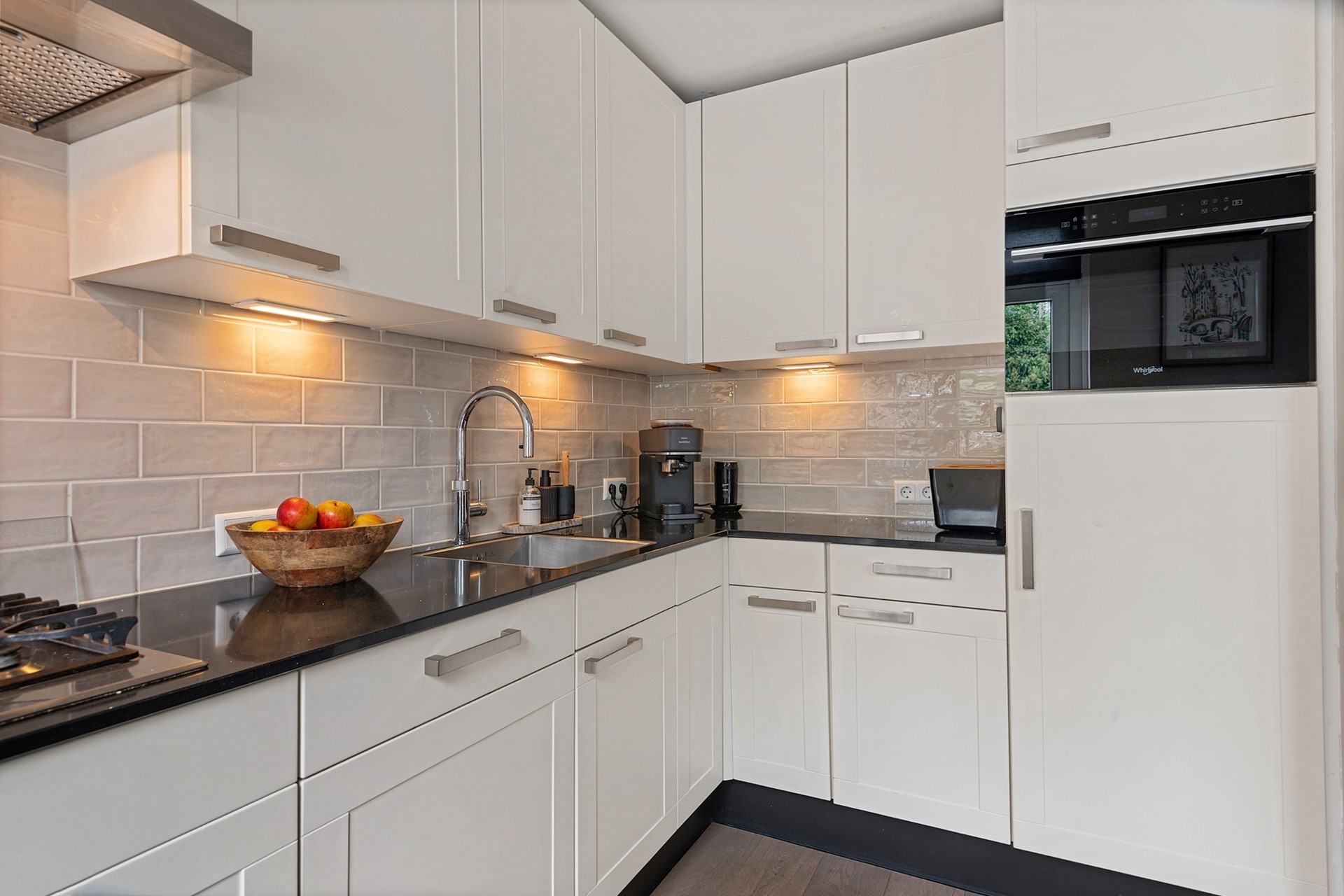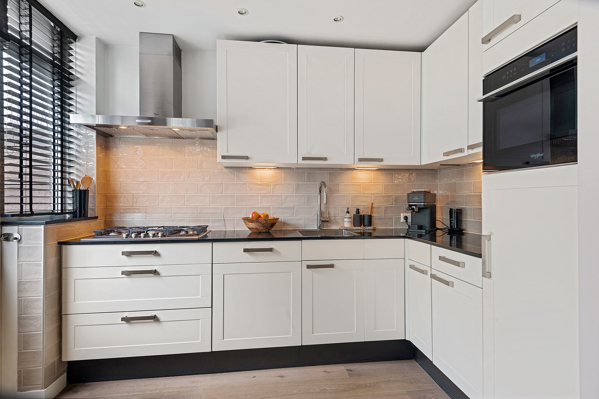 De open keuken is voorzien van een 5-pitsgasfornuis, combi-oven, quooker (2025), afzuigkap, afwasmachine en een koelkast. De vele keukenkasten bieden veel opbergruimte en vanuit hier heeft u een deur naar de achtertuin.