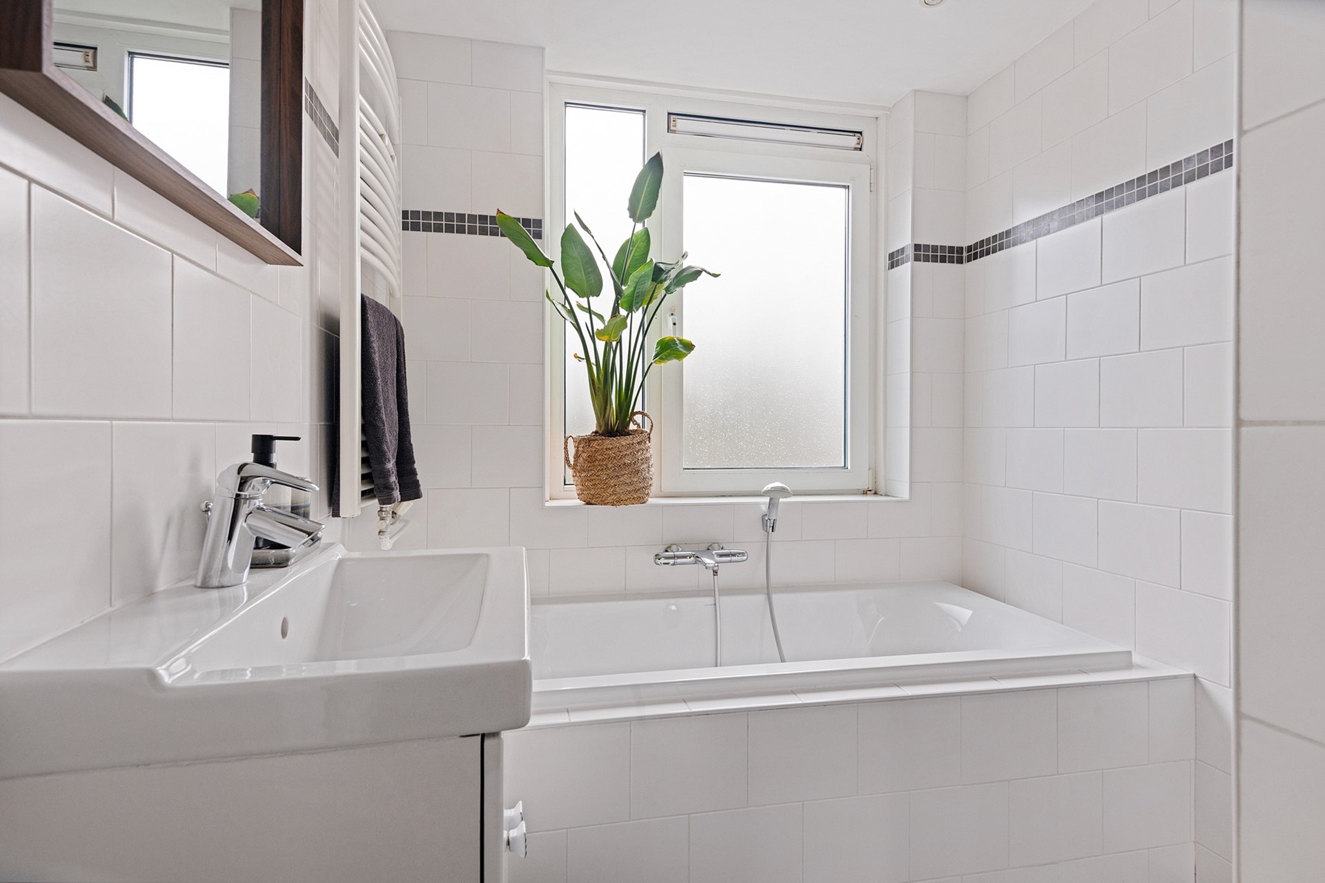 De badkamer is voorzien van een inloopdouche, een ligbad en wastafel met meubel.