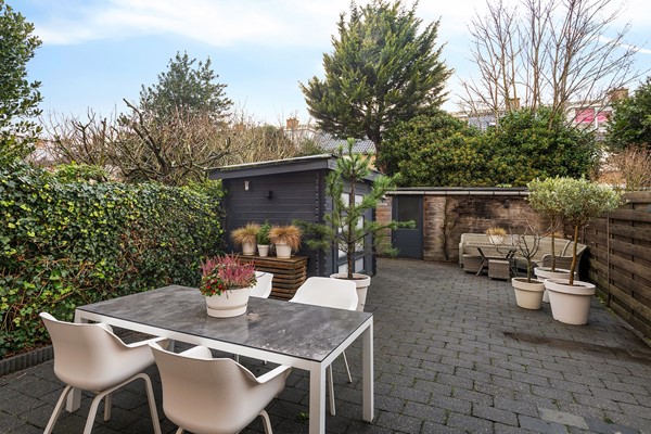 De voortuin (ca. 33m2) met zonwering is gelegen op het zuidoosten. De beschutte achtertuin (ca. 74m2) is gelegen op het noordwesten en beschikt over een buitenkraan en achterom naar de bergingen.