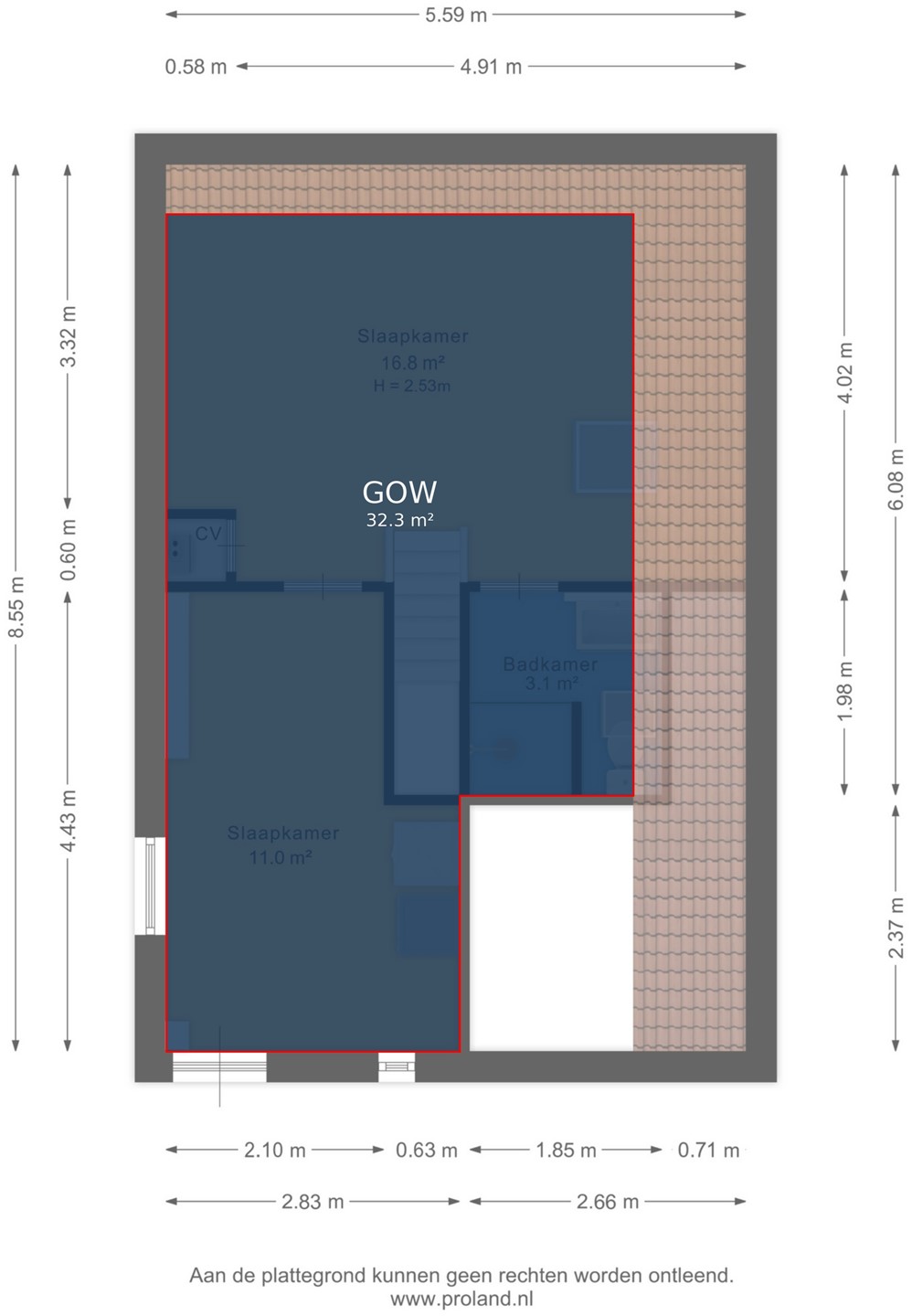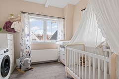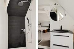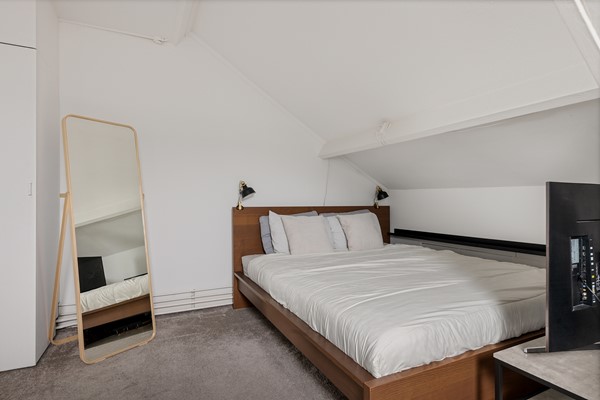 Via de trap bij de entree loop je naar boven en kom je gelijk in de grote slaapkamer (ca. 16,8m2), aan de rechterkant bevindt zich de badkamer met inloopdouche, wastafel met meubel en het tweede toilet. Aan de rechterzijde is de 2e slaapkamer (ca. 11m2).