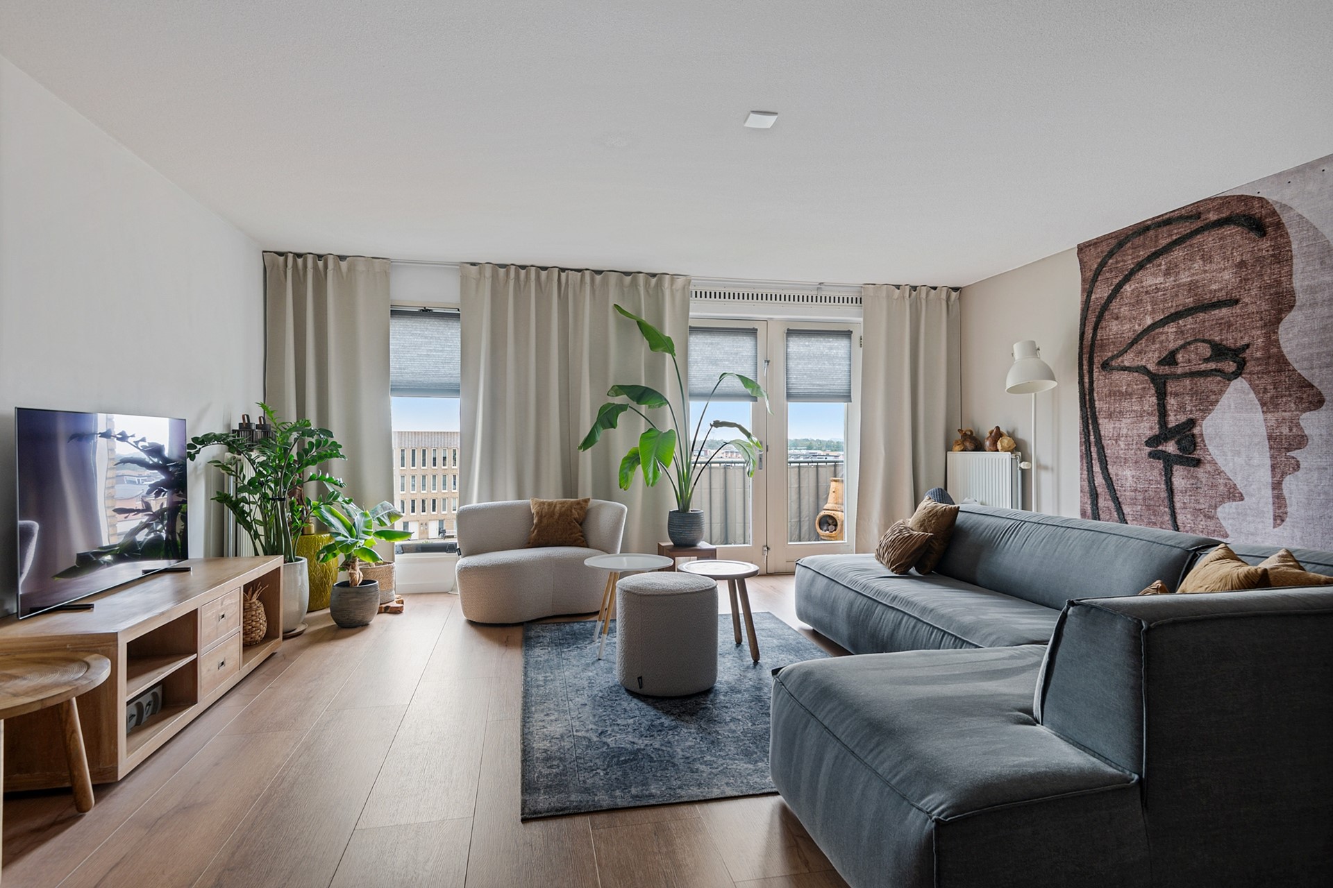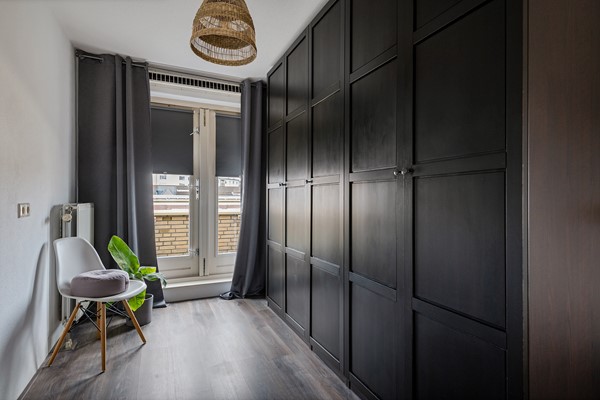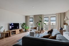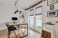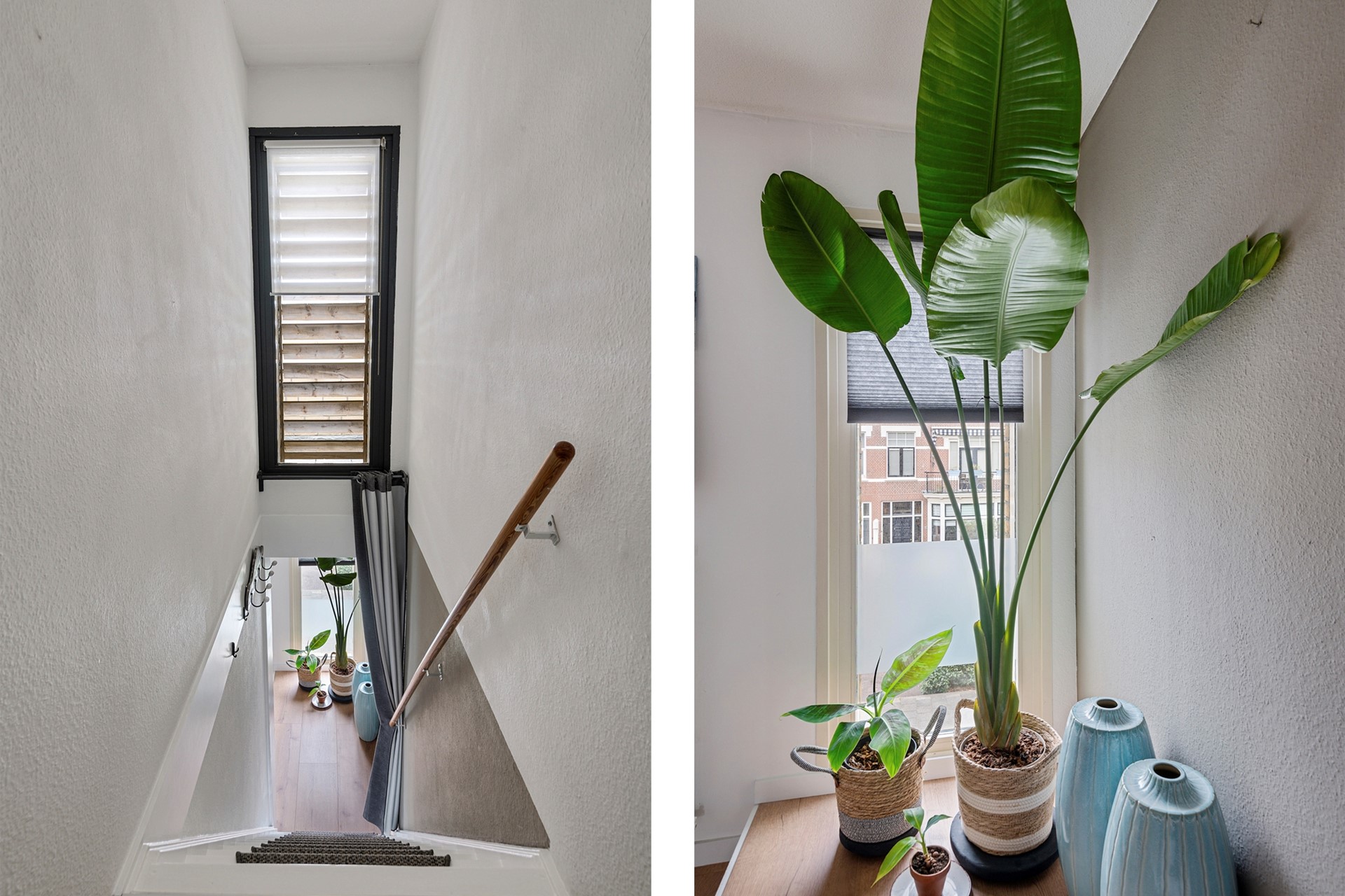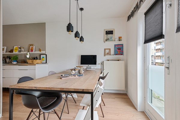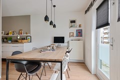 Entree; toilet met fontein met daarnaast gelegen een ruime berging met aansluiting voor wasmachine, droger en stadsverwarmingsinstallatie. Aan de achterzijde is het woongedeelte met hoge ramen en een openslaande deur naar het eerste balkon met vrij uitzicht. De halfopen keuken met diverse luxe inbouwapparatuur zoals een vaatwasser (2025), oven en koel/vriescombinatie, en een kookplaat (2025) met afzuigkap ligt tussen de woonkamer en eetkamer in. Aan de straatzijde is de ruime eetkamer met openslaande deuren en een frans balkon. Vanuit de eetkamer is er de trap naar de tweede verdieping. .