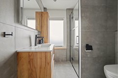 Op de eerste verdieping is de indeling als volgt: overloop met wasruimte, twee royale en een kleinere derde slaapkamer (346 x 294, 346 x 288, beide met vaste kasten en 210 x 204) en de prachtige badkamer (207 x 191) met elektrische vloerverwarming, mechanische ventilatie, inloopdouche, tweede toilet en badkamermeubel met wastafel. De 2 slaapamers aan de tuinzijde zijn voorzien van een elektrisch rolluik met zonnecollectoren.