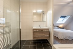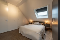 Op de tweede verdieping vind je de ruime slaapkamer, compleet met een groot dakraam en toegang tot de bergzolder via een vlizotrap — ideaal voor koffers, seizoensspullen en alles wat je uit het zicht wilt bewaren. Daarnaast is er nog een aparte bergruimte voor extra opslag en de opstelplaats van de CV-ketel.