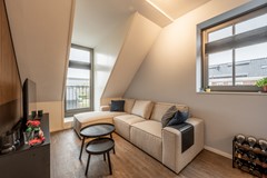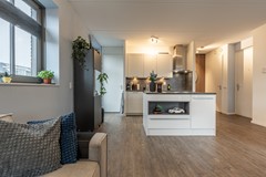 De ruime woonkamer is licht en sfeervol dankzij de grote ramen en biedt voldoende ruimte voor zowel een eet- als zitgedeelte. Vanuit hier heb je toegang tot het balkon op het zuidwesten. Een heerlijke plek waar je zó een gezellig zitje neerzet om van het buitenleven en de zon te genieten.