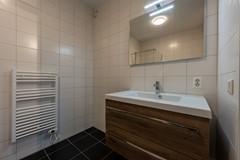 De moderne badkamer is uitgerust met een comfortabele inloopdouche, een strak wastafelmeubel en de aansluiting voor de wasmachine. Alles voelt fris, modern en direct klaar voor gebruik.