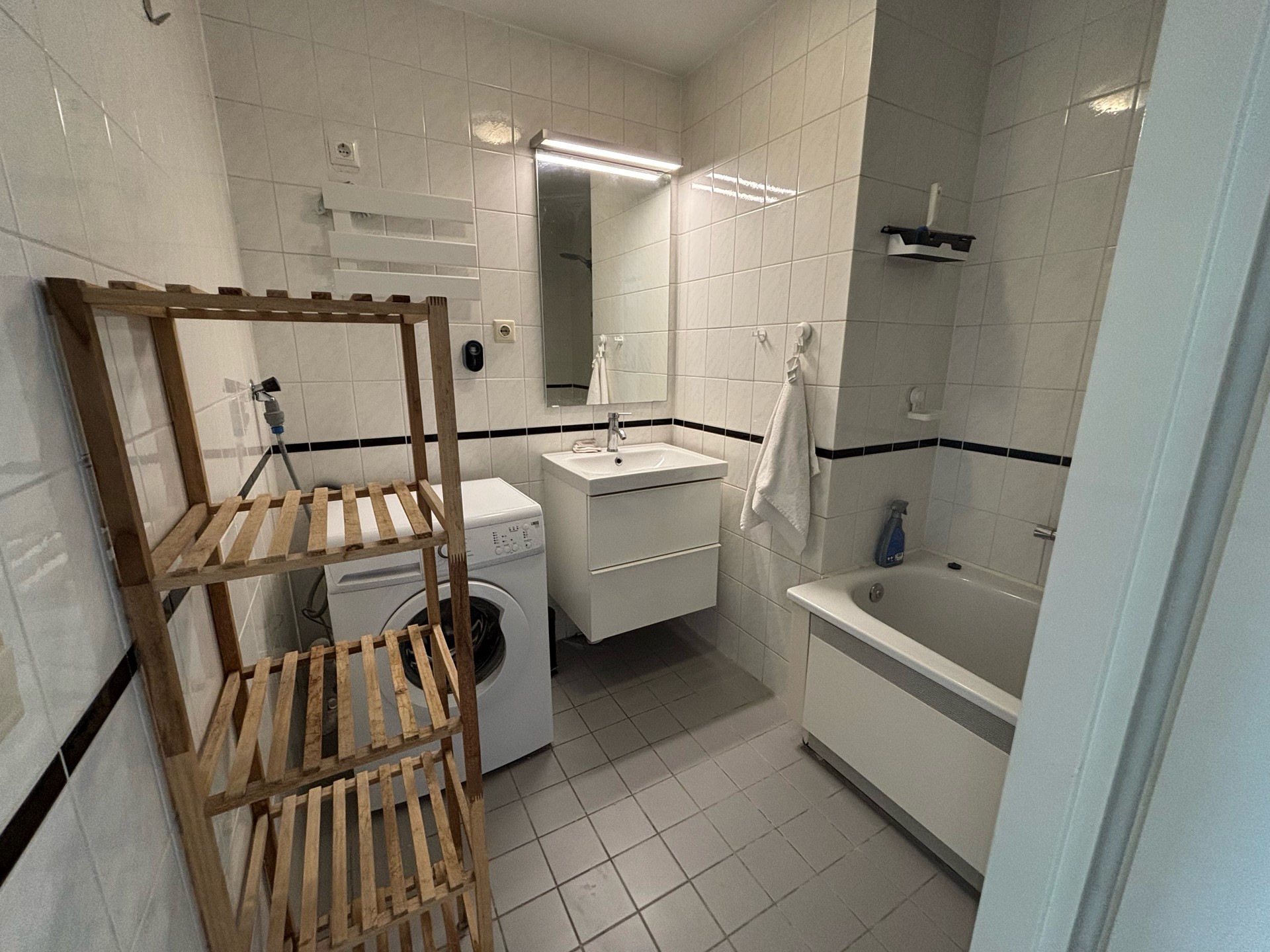 De ruime badkamer is voorzien van bad, wastafel met meubel en een wasmachine. Grote slaapkamer bevindt zich aan de voorzijde van het appartement en is voorzien van kast en bed. De meer compacte slaapkamer is eveneens ingericht met een bed en kast en geeft daarnaast toegang tot het balkon, net als de woonkamer.