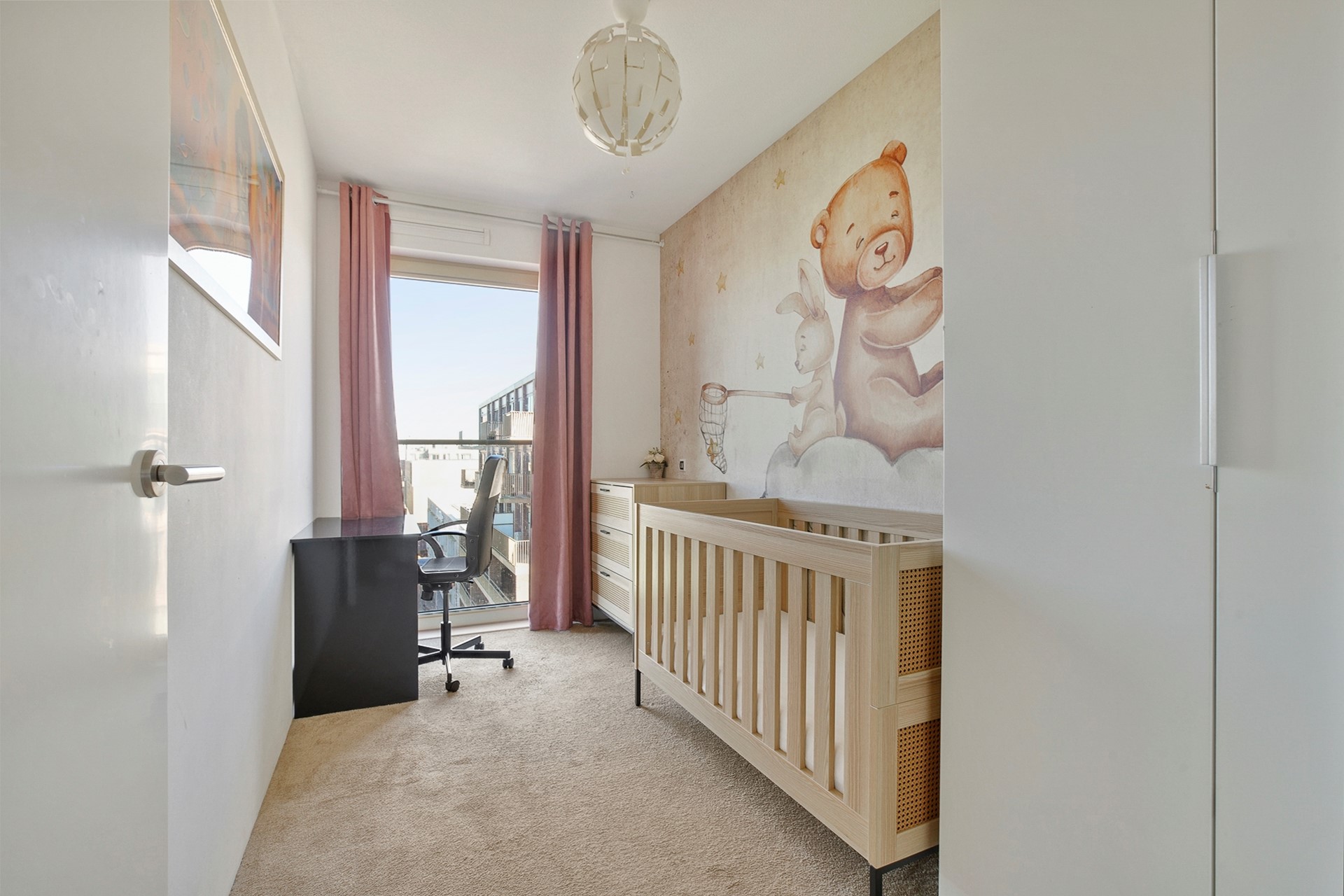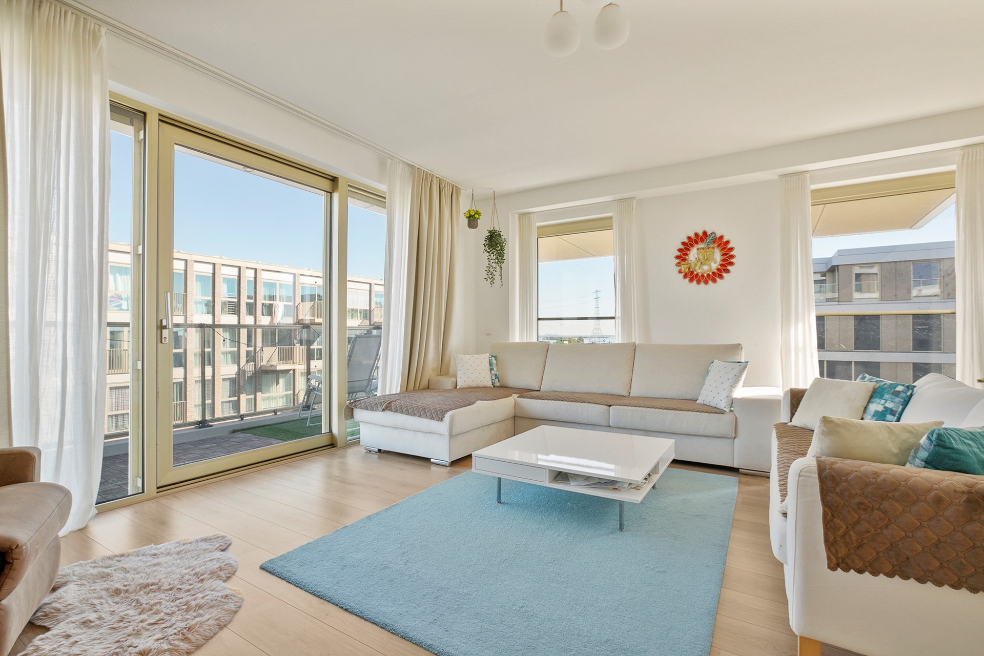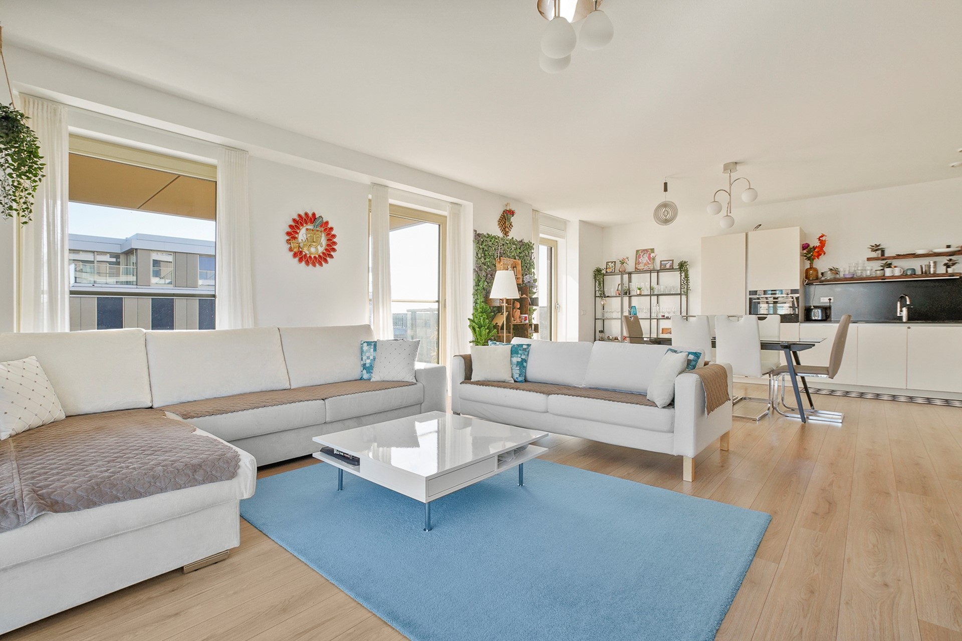 Through the spacious entrance with a double elevator, you reach the corner apartment on the fifth floor. You enter a large hallway that provides access to three spacious bedrooms, a toilet, a modern bathroom with a walk-in shower, a second toilet, and a sink, a storage room with space for a washing/drying machine, and of course, the living room. The modern living room features plenty of natural light thanks to large tilt-and-turn windows and a sliding door that opens to multiple balconies facing northeast and southeast (with a total area of approximately 19 m²). The spacious layout allows you to enjoy the beautiful views at all times. The practical kitchen is equipped with Siemens appliances: a combi-oven, an electric hob with an extractor, a large refrigerator with a freezer, and a dishwasher. Three bedrooms, a bathroom with shower and a separate toilet as well as a laundry room with washer-dryer. The entire apartment has underfloor heating, which can be adjusted per room. Mechanical ventilation is adjustable throughout the apartment. Due to its location in the complex, this corner apartment has only one adjacent unit on the same floor.