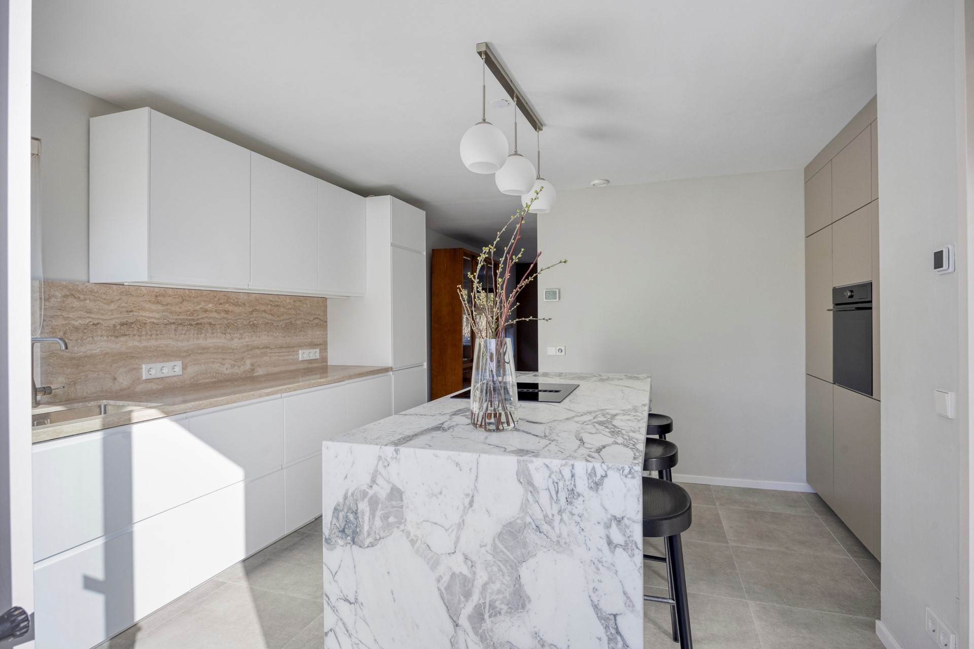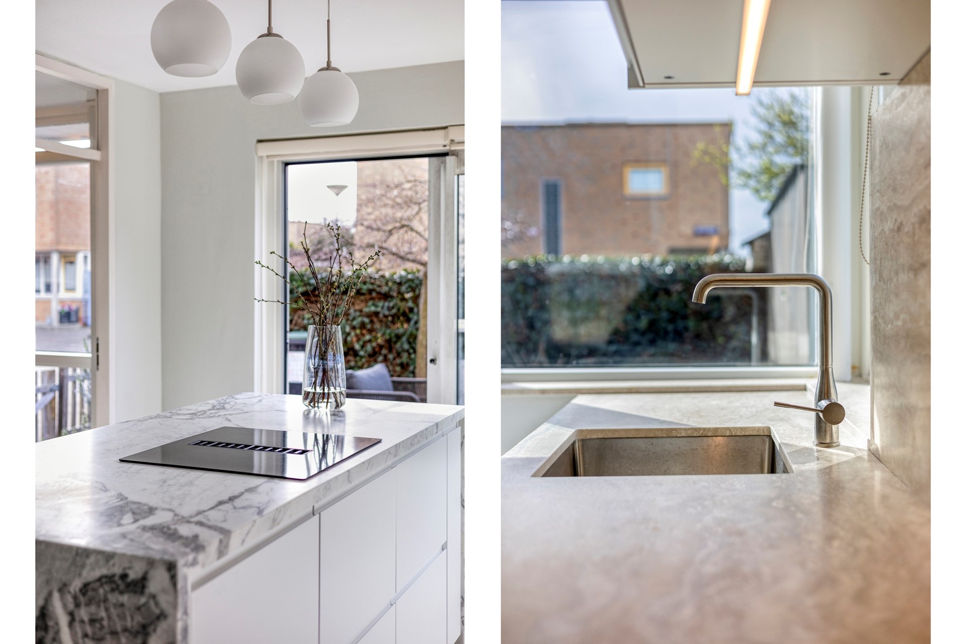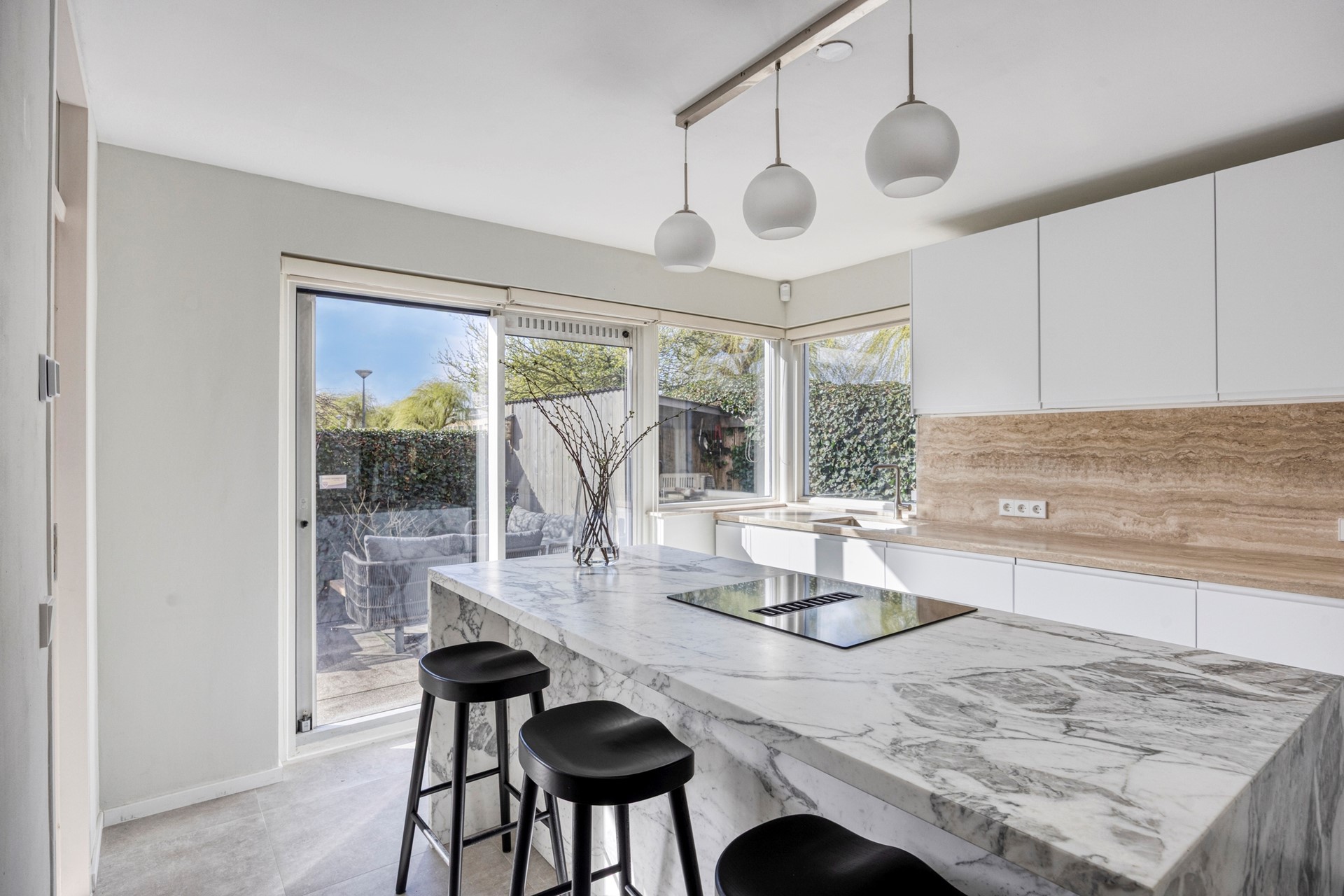 De moderne keuken is uitgerust met een marmeren kookeiland en biedt direct toegang tot het terras en de achtertuin. Aansluitend bevindt zich een charmante kruidentuin met onder andere rozemarijn, tijm en laurier.