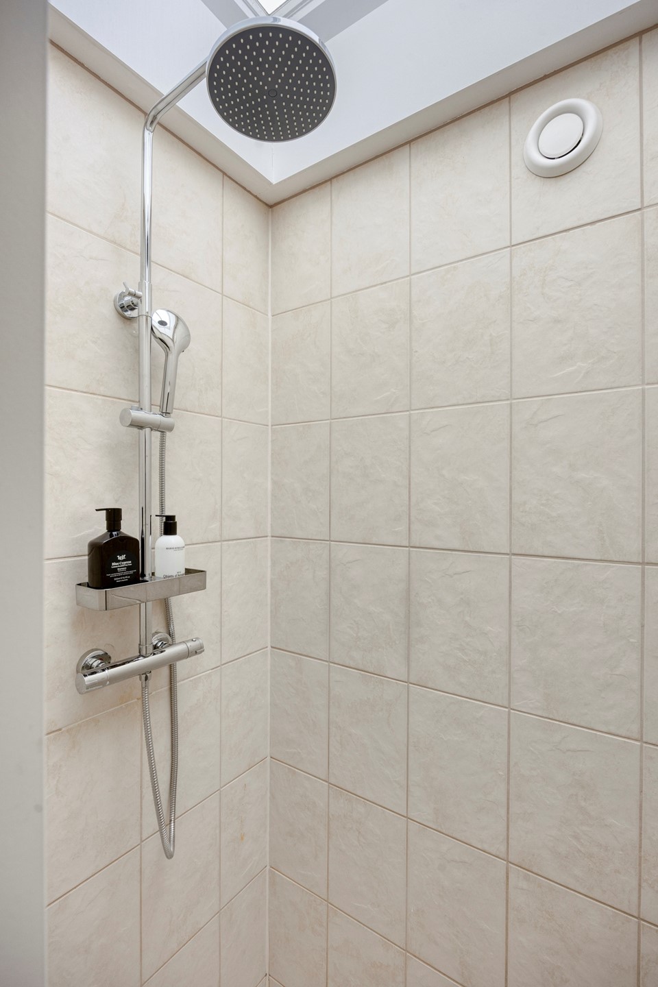 Aangrenzend bevindt zich een ruime walk-in closet, die zorgt voor een praktische en stijlvolle kleedruimte met voldoende opbergruimte. De en-suite badkamer is voorzien van een moderne douche en maakt deze verdieping tot een volledig zelfstandige suite.