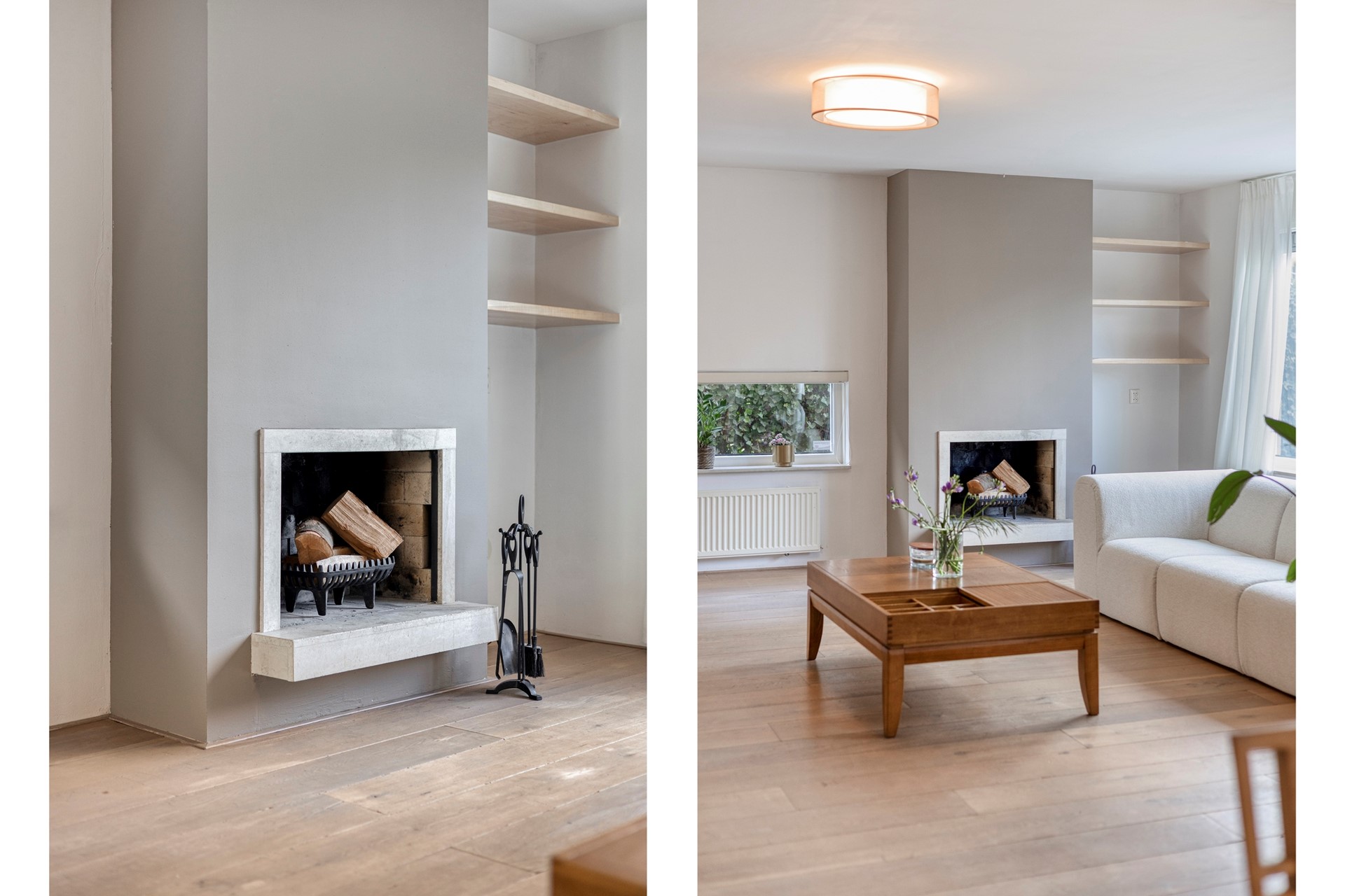 De begane grond beschikt over een lichte en ruime woonkamer met grote raampartijen en een open karakter, voorzien van een sfeervolle open haard en een directe verbinding met de eetkamer.