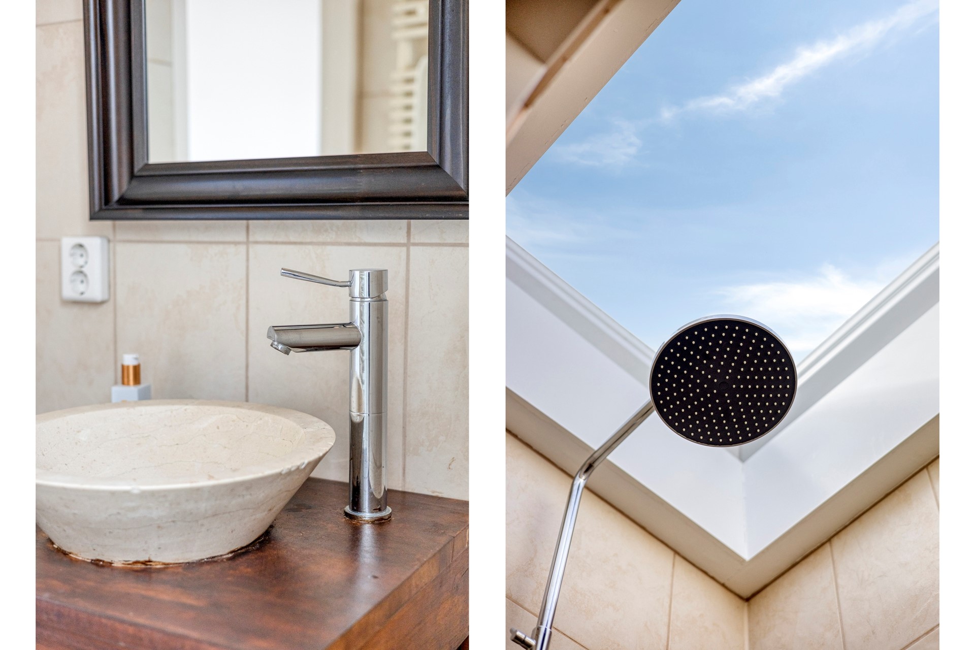 De ruime badkamer is voorzien van een ligbad en wordt aangevuld door een praktische indeling die comfort en functionaliteit combineert.