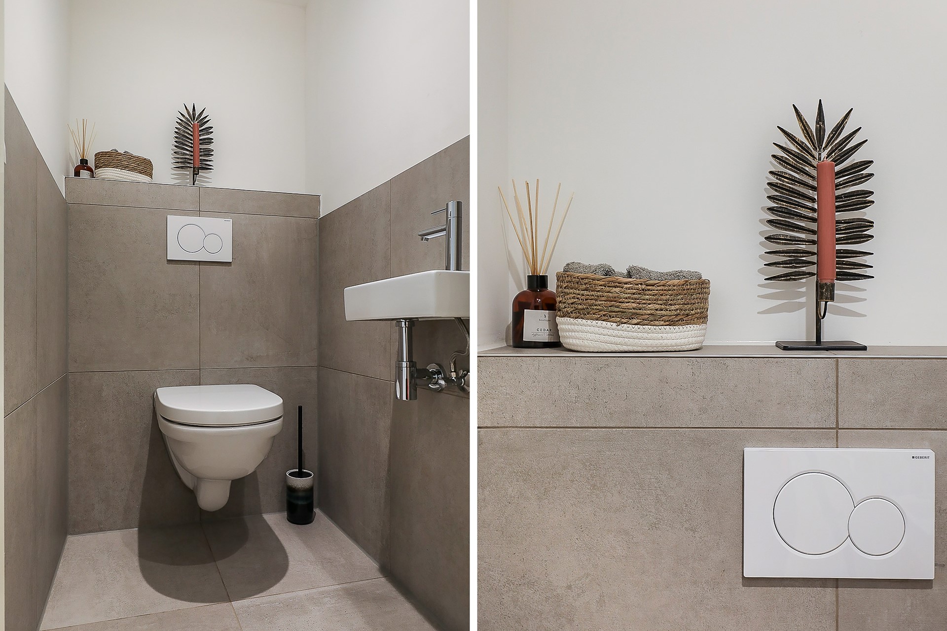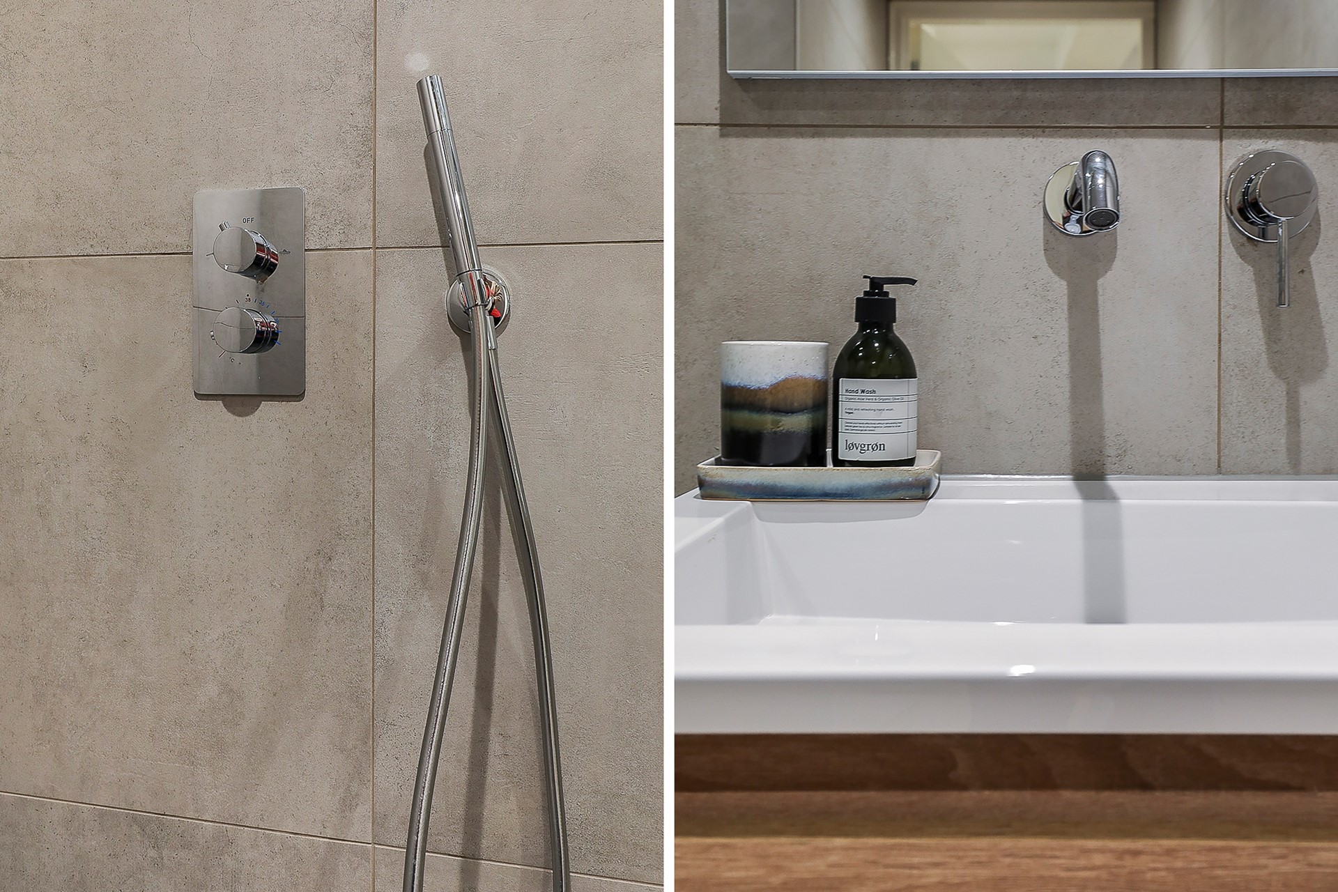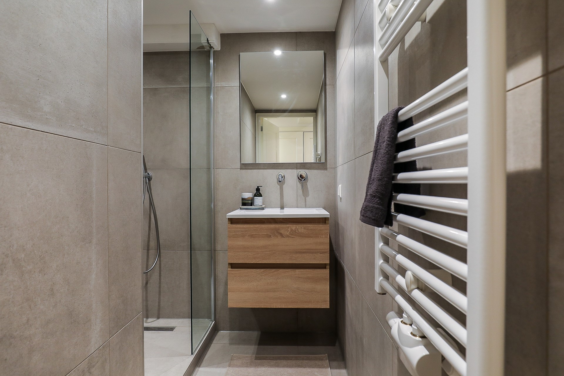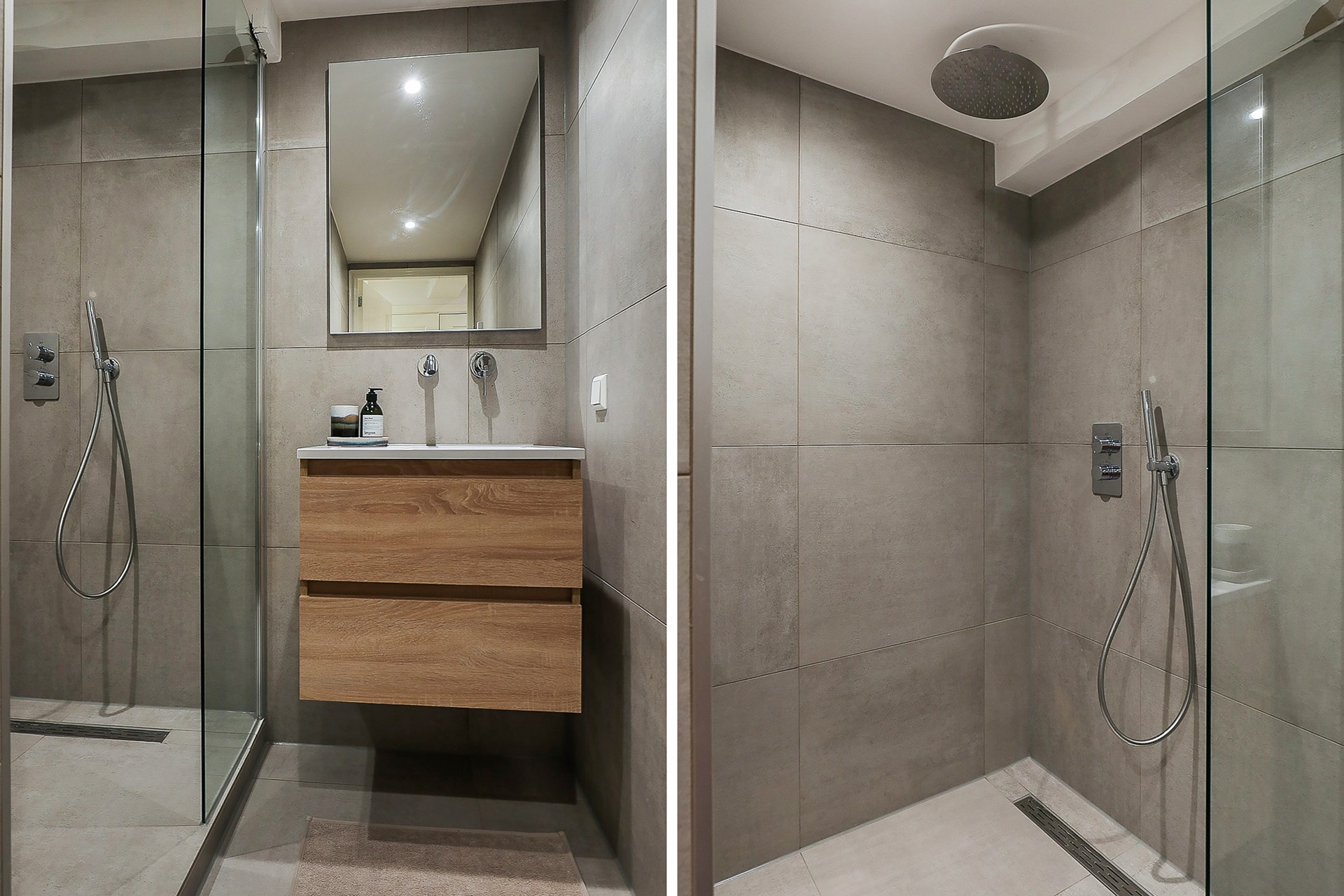 From the hallway, there is also a separate toilet with a small sink. The second bathroom is equipped with a design radiator, washbasin with built-in tap, and a walk-in rain shower.