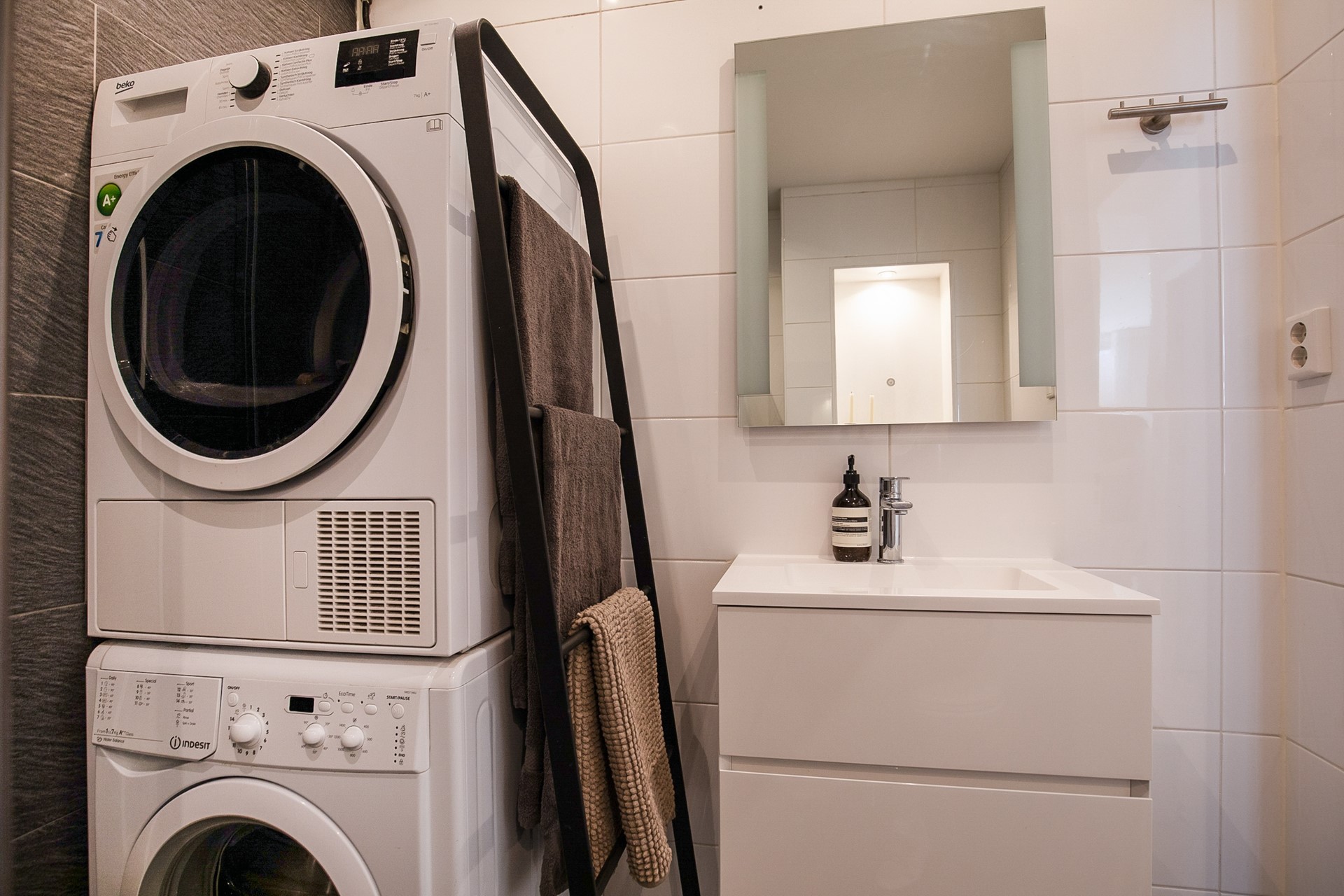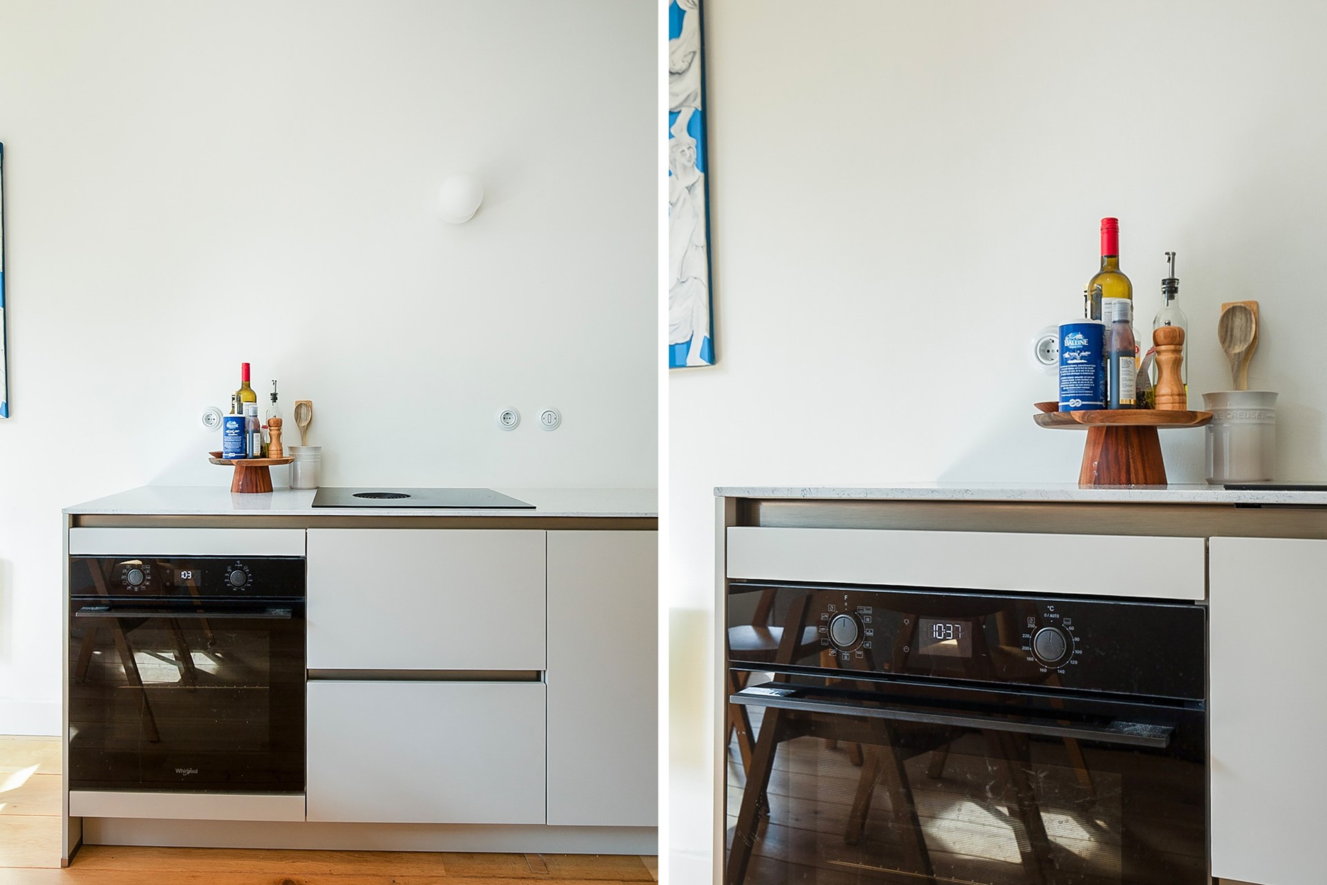 At the back you’ll find the bright living room with large windows. The open kitchen, fully renewed in 2024, is fitted with modern built-in appliances including an induction cooktop, oven and dishwasher. Its contemporary design and practical layout make it both functional and inviting – perfect for cooking and entertaining.