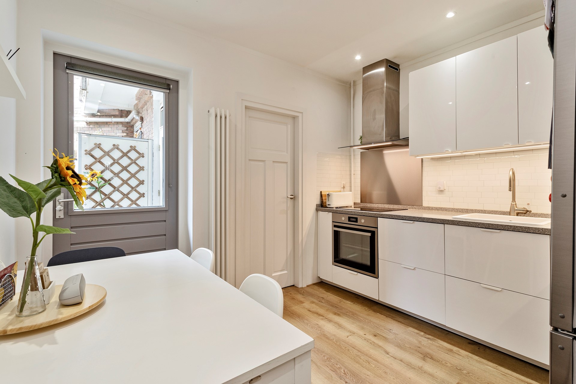 Fully equipped open kitchen wit hall kitchen appliances. The renovated modern bathroom has a spacious shower, bath, mirror, designer radiator and washbasin with separate toilet. Two bedrooms, both with patio doors . Please note: the smaller bedroom will be delivered empty except of a wardrobe.