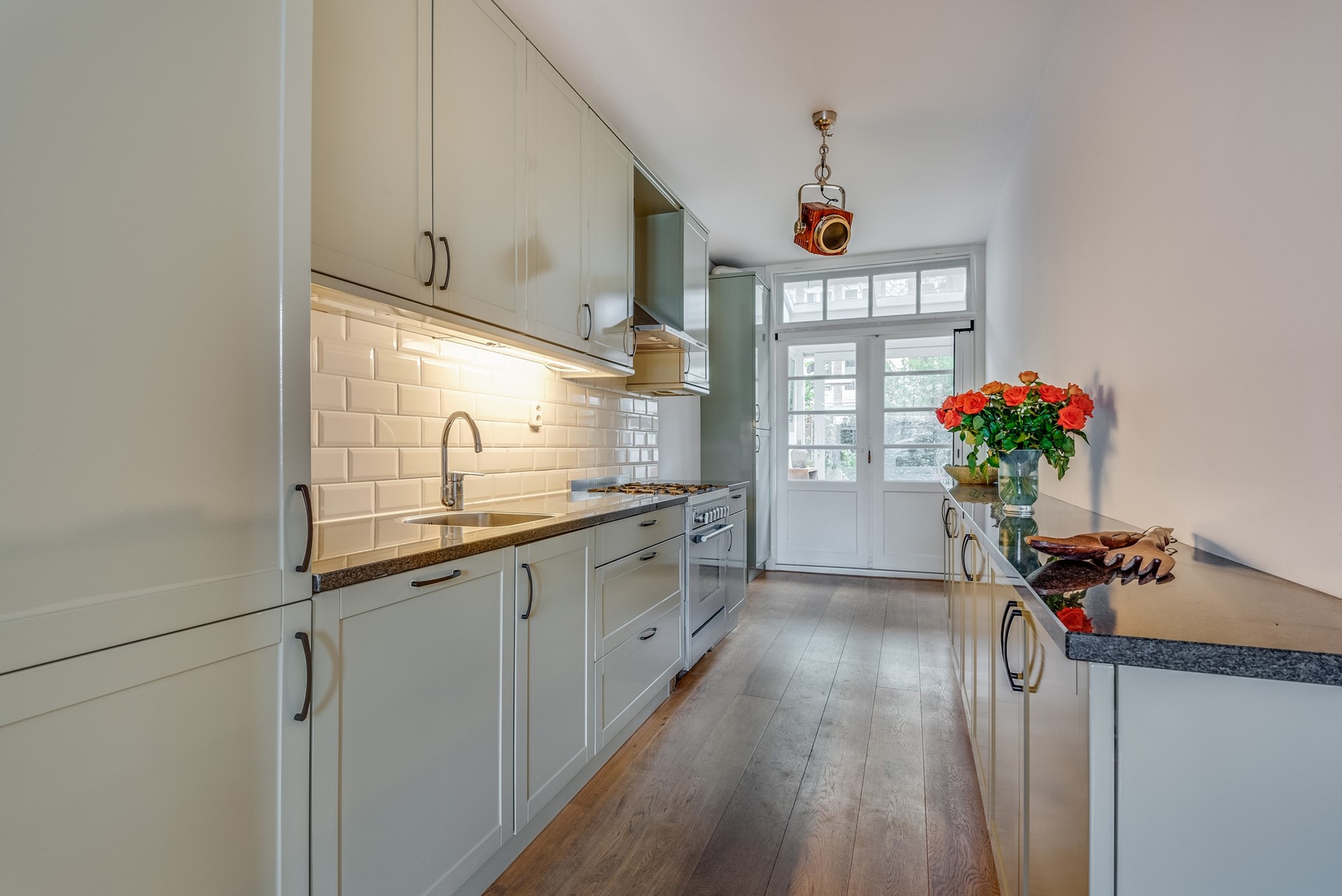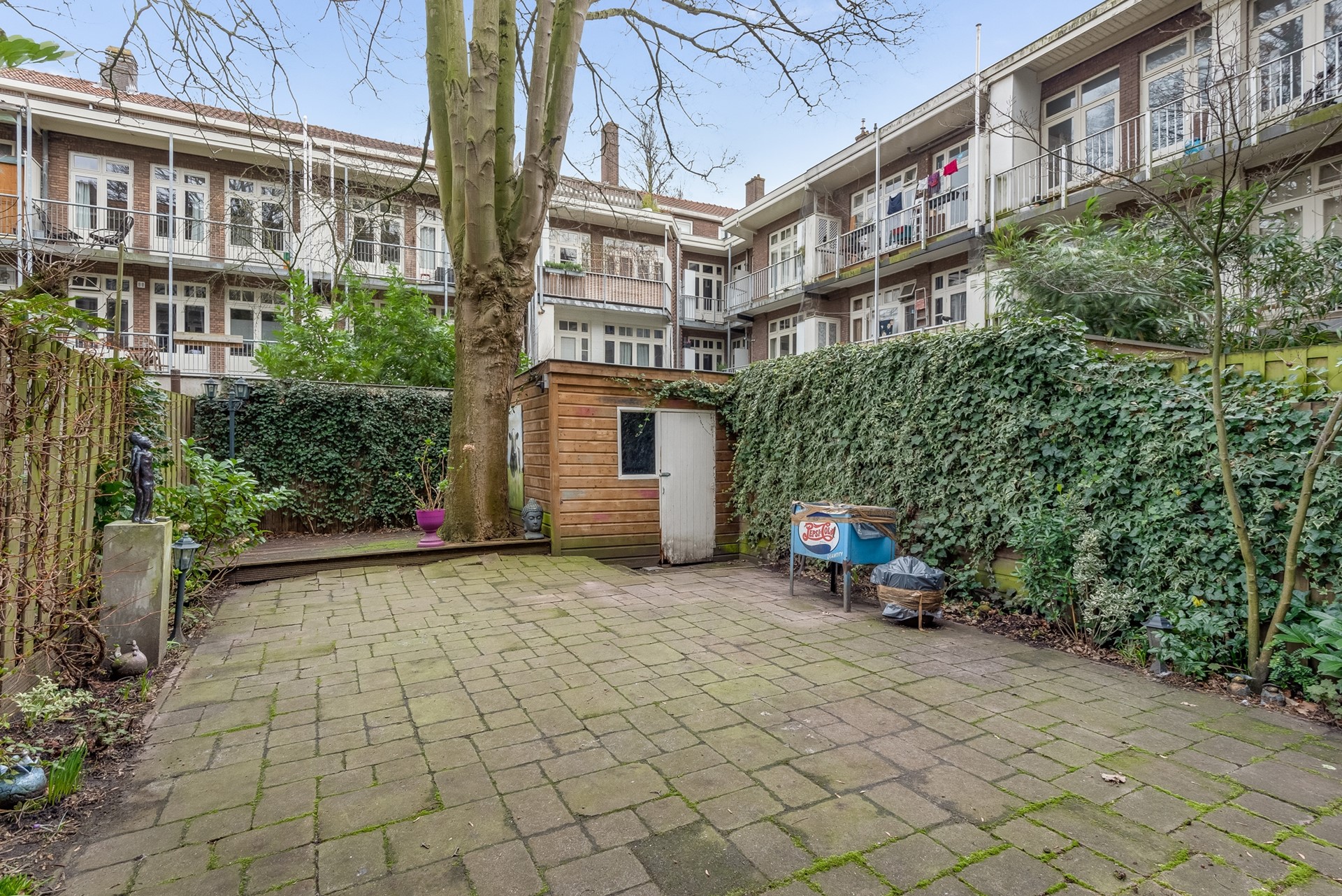 Aan de achterzijde bevindt zich de serre, die direct aansluit op de circa 40 m² grote achtertuin. De tuin is omsloten door omliggende appartementen en aangrenzende tuinen, wat zorgt voor een beschutte en rustige buitenruimte midden in de stad.