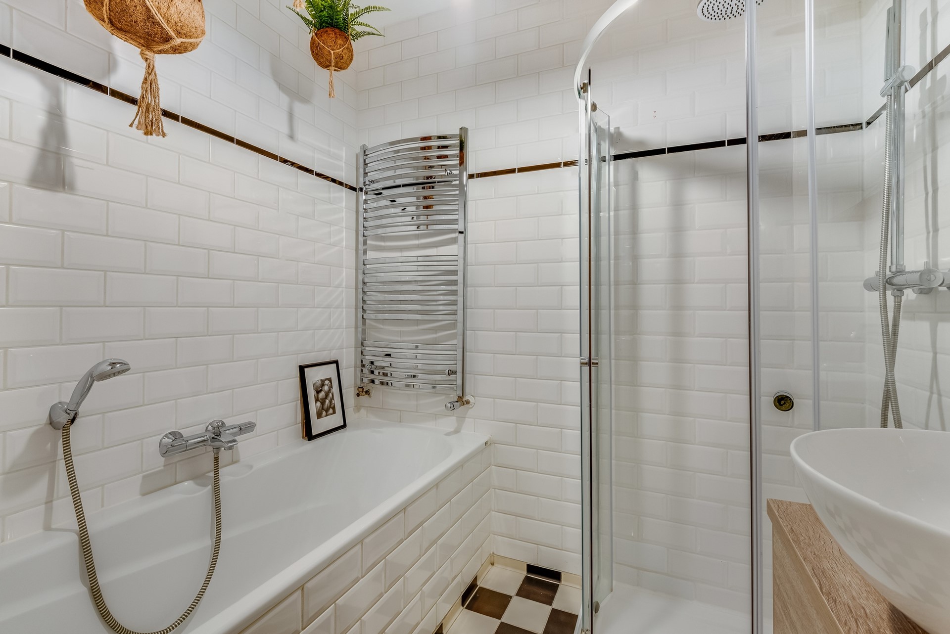 The bathroom is practically designed with a bathtub and shower in one. There is also a separate toilet.