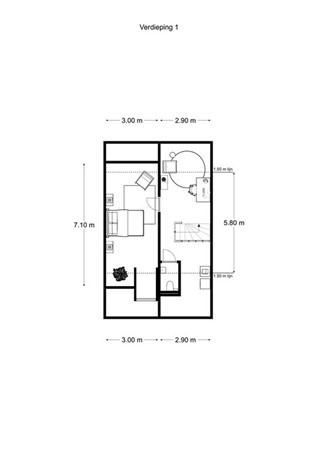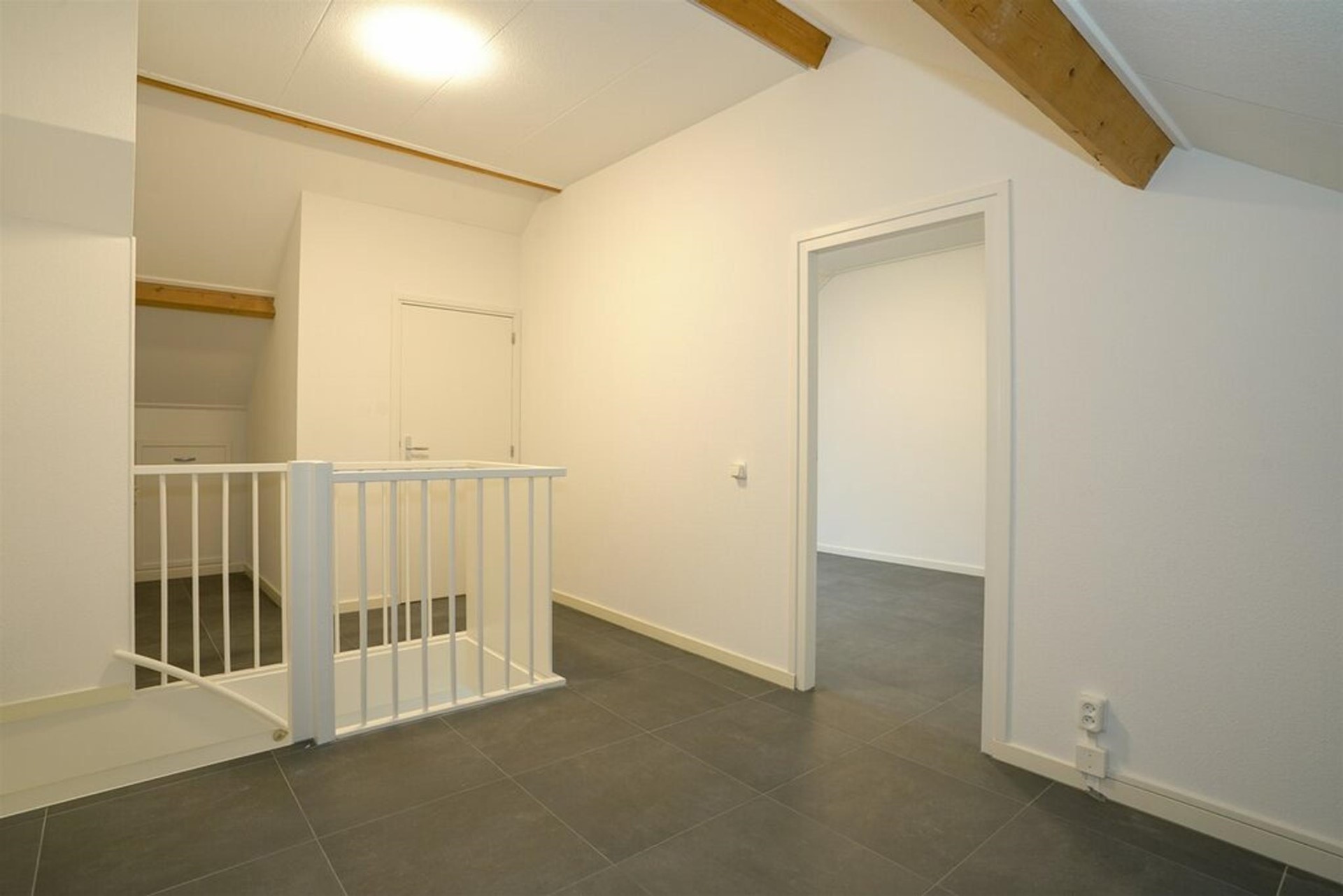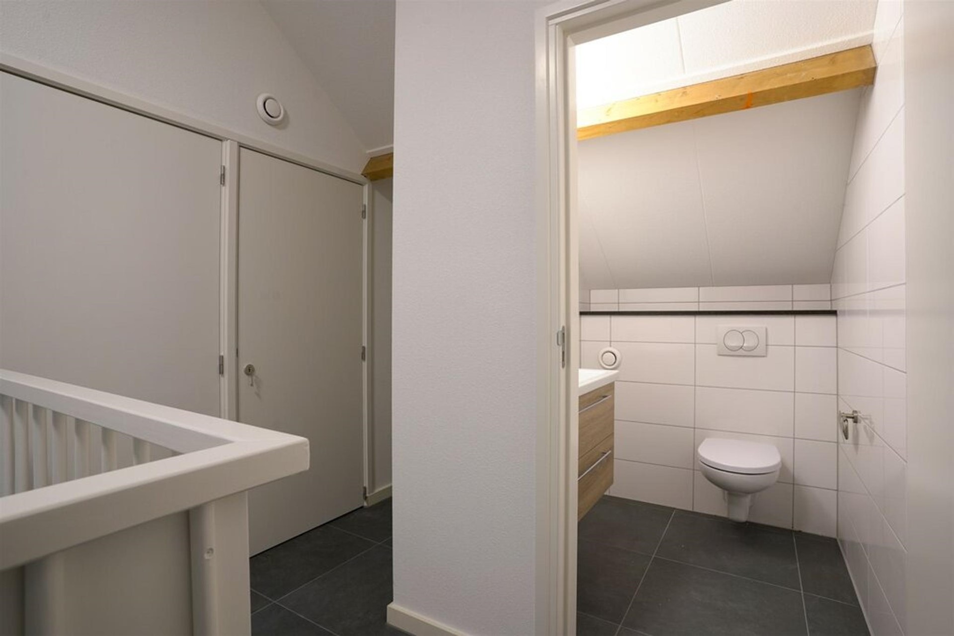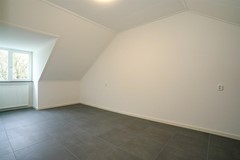 De overloop is een grote ruimte die je deels kunt gebruiken als werk-, studeer- of hobbyruimte. Aan de voorzijde zijn een nieuwe extra toiletruimte gerealiseerd en een praktische berging in de schuinte van het dak. De toiletruimte is ingedeeld met een wandcloset en een wastafel met badmeubel.