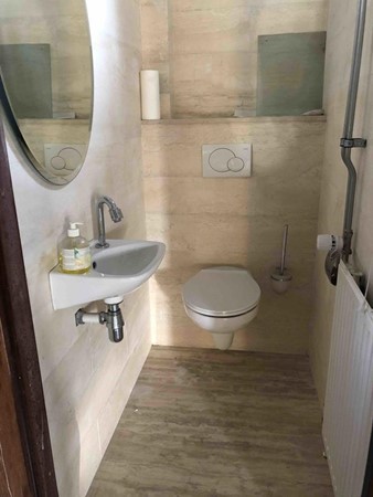 Voorzien van een keurig betegelde toiletruimte, met hangend toilet en fonteintje.
