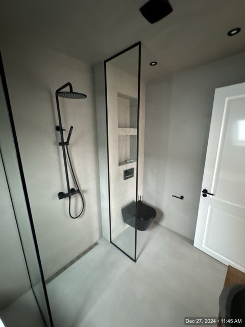 The spacious living room features a modern, handcrafted open kitchen, fully equipped with high-quality built-in appliances. The stylish bathroom includes a walk-in shower, bathtub, toilet, and sink, with sleek black faucets and a concrete floor adding to the luxurious, contemporary look. Large windows throughout the apartment flood the space with natural light, creating a bright and open atmosphere. The cozy bedroom is located upstairs, offering privacy while still being part of the open living area.