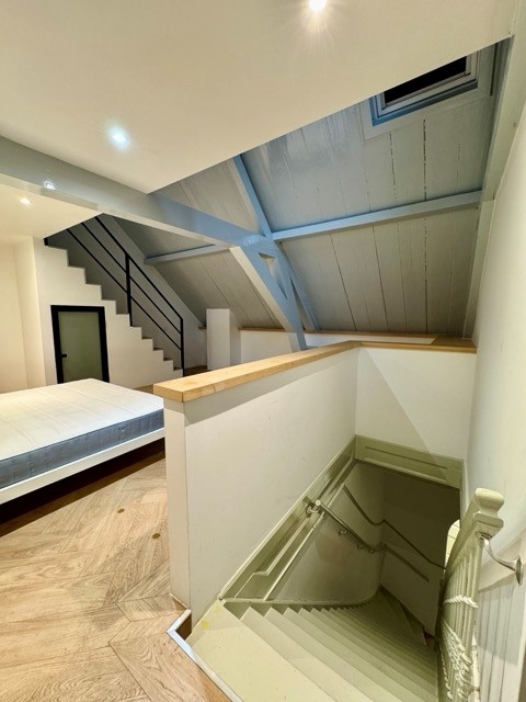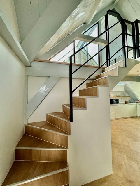 Het appartement bevindt zich op de derde verdieping en heeft een privé-ingang direct naast de hoofdentree van het gebouw. Bij binnenkomst leidt de eerste trap naar een toilet, ideaal voor gasten.