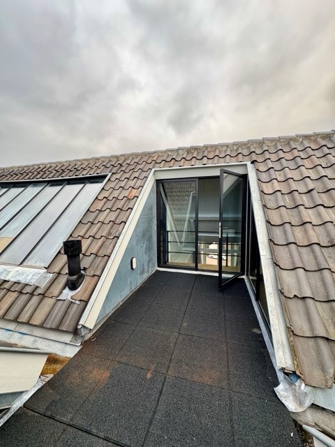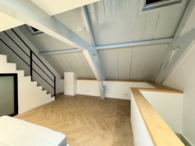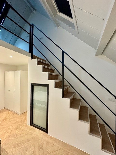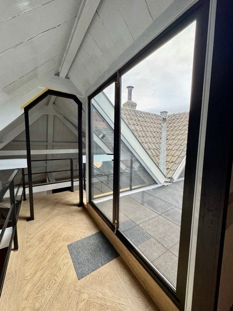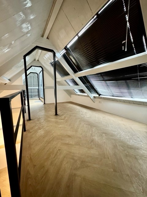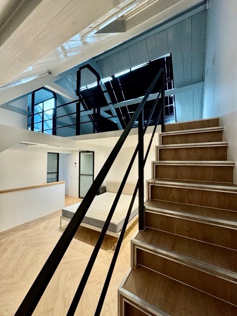 Vanaf de rechterzijde van de slaapkamer leidt een trap naar het loftgedeelte. Hier bevindt zich een flexibele ruimte die kan dienen als thuiskantoor. Vanuit het loftgedeelte is ook het dakterras bereikbaar, een privébuitenruimte om te ontspannen of van het uitzicht te genieten. Aan het einde van de loftgang leidt een trap terug naar de woonkamer.
