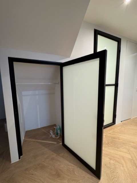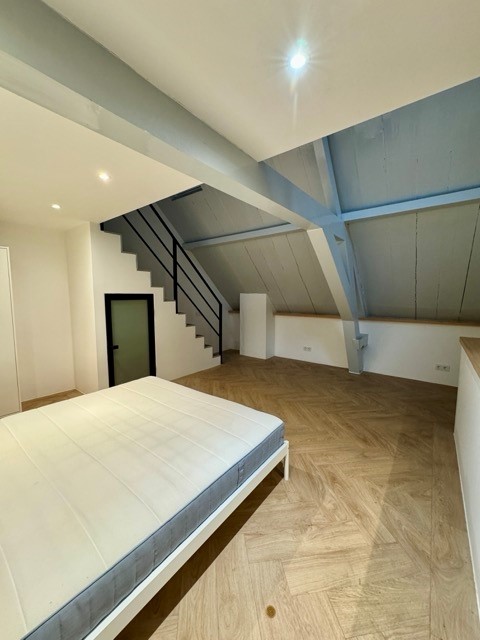 Rechts van de trap bevindt zich een knusse slaapkamer. Deze kamer heeft een eigen bergruimte en een privébadkamer, voorzien van een inloopdouche, toilet en wastafel. De strakke zwarte kranen en betonvloer geven de badkamer een luxe, eigentijdse uitstraling die past bij de rest van het appartement.