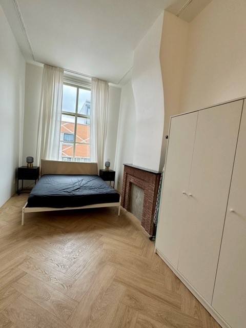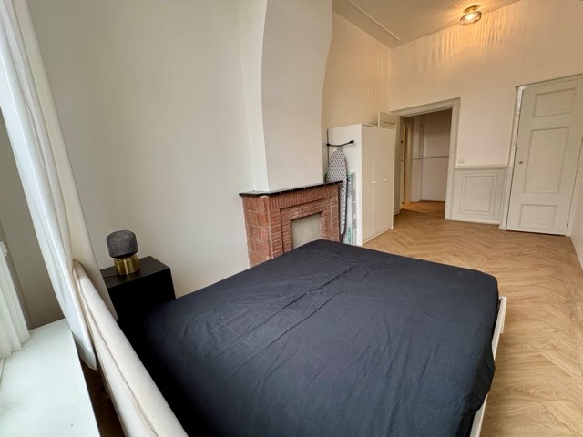 De eerste slaapkamer ligt aan de rechterzijde en is voorzien van een tweepersoonsbed, een charmante bakstenen open haard en een groot raam met uitzicht op de straat. Tegenover deze kamer bevindt zich de moderne badkamer, uitgerust met een inloopdouche, toilet, wastafel en een combi was-droogmachine. Strakke zwarte kranen en een gepolijste betonvloer geven de badkamer een luxe, eigentijdse uitstraling.