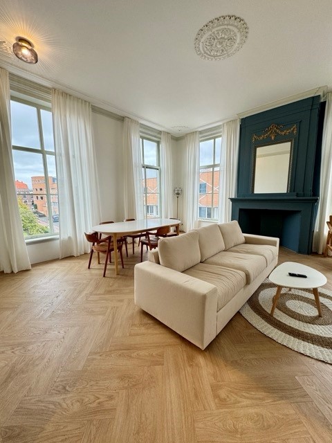 Verder in de gang ligt de tweede kamer aan de rechterzijde: de lichte en ruime woonkamer met eetgedeelte. Een tweede open haard voegt warmte en karakter toe aan deze ruimte. Grote hoekramen laten veel daglicht binnen en bieden een prettig uitzicht op de straat beneden.