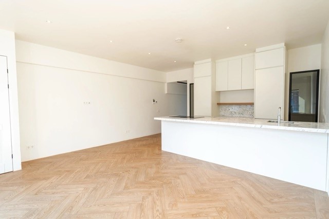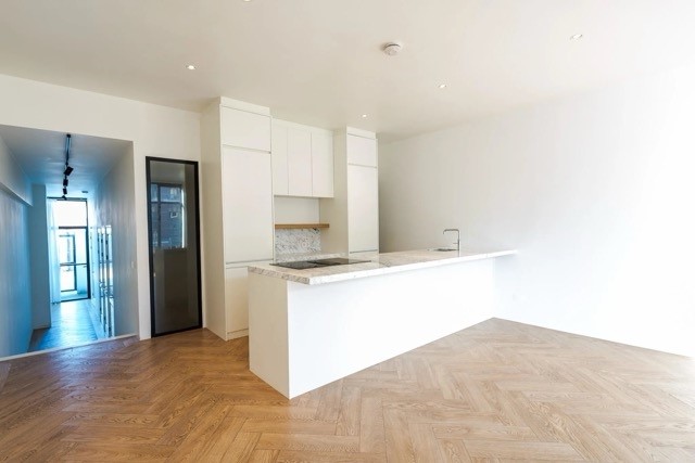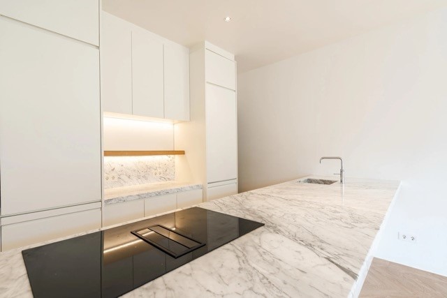De moderne open keuken met Quooker onmiddelijk kokend water systeem is naadloos geïntegreerd met een in de leefruimte en beschikt over een stijlvolle kookeiland met marmeren aanrechtblad. De keuken is volledig uitgerust met hoogwaardige inbouwapparatuur en biedt voldoende opslag- en werkruimte — ideaal om te koken en gasten te ontvangen. Vanuit de woonkamer is er directe toegang tot het privéterras.