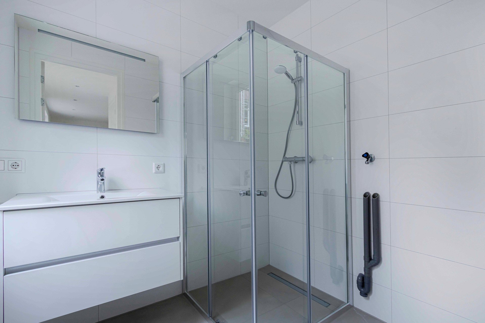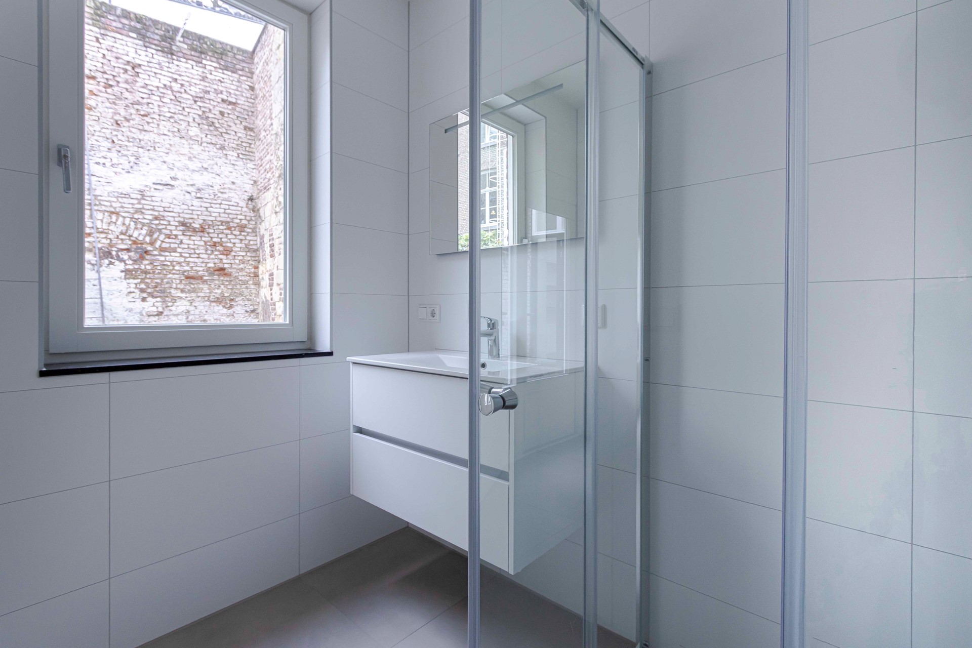 Nieuwe badkamer met douchecabine, wastafelmeubel en aansluiting voor de wasmachine.