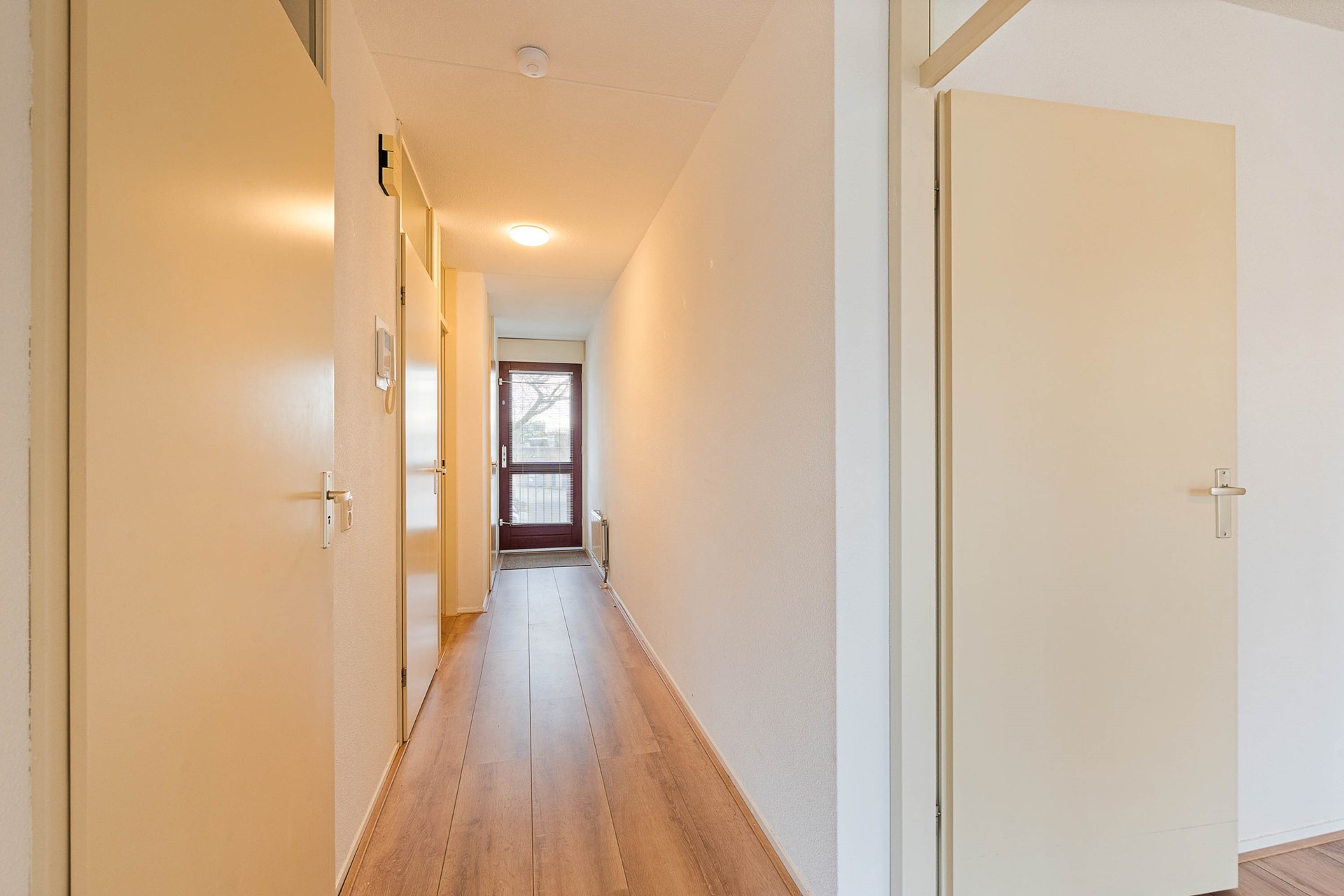Entree, hal met videofooninstallatie, berging en toiletruimte. Royale woonkamer met schuifpui naar het zonnige terras. Half open keuken in hoekopstelling voorzien van 4-pits gaskookplaat, afzuigkap, 1e royale (ouder)slaapkamer met vaste kastenwand en 2e ruime slaapkamer met vaste kast voorzien van opstelling c.v. combiketel. Geheel betegelde badkamer met douchecabine, wastafel, handdoekradiator en aansluiting voor wasmachine.