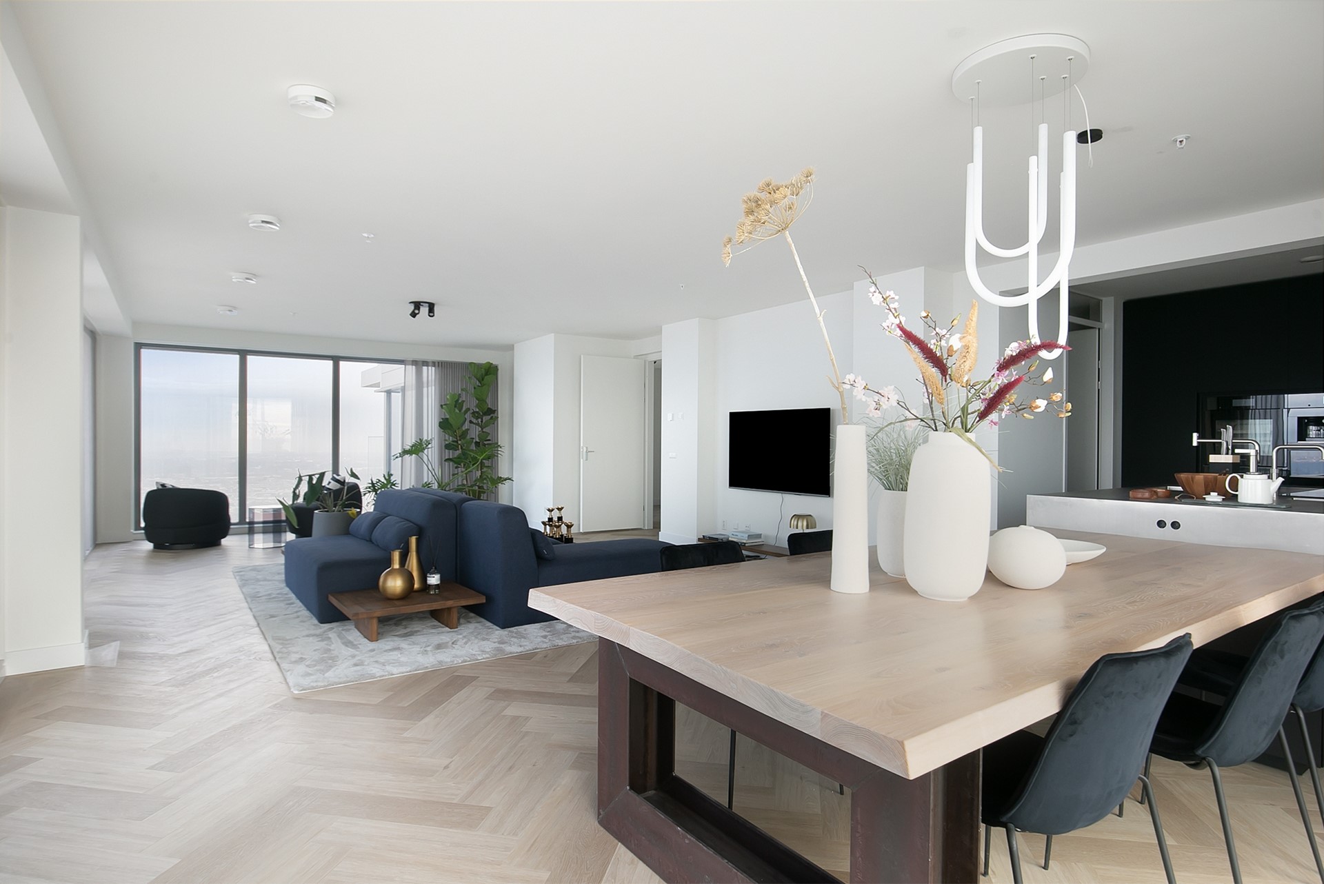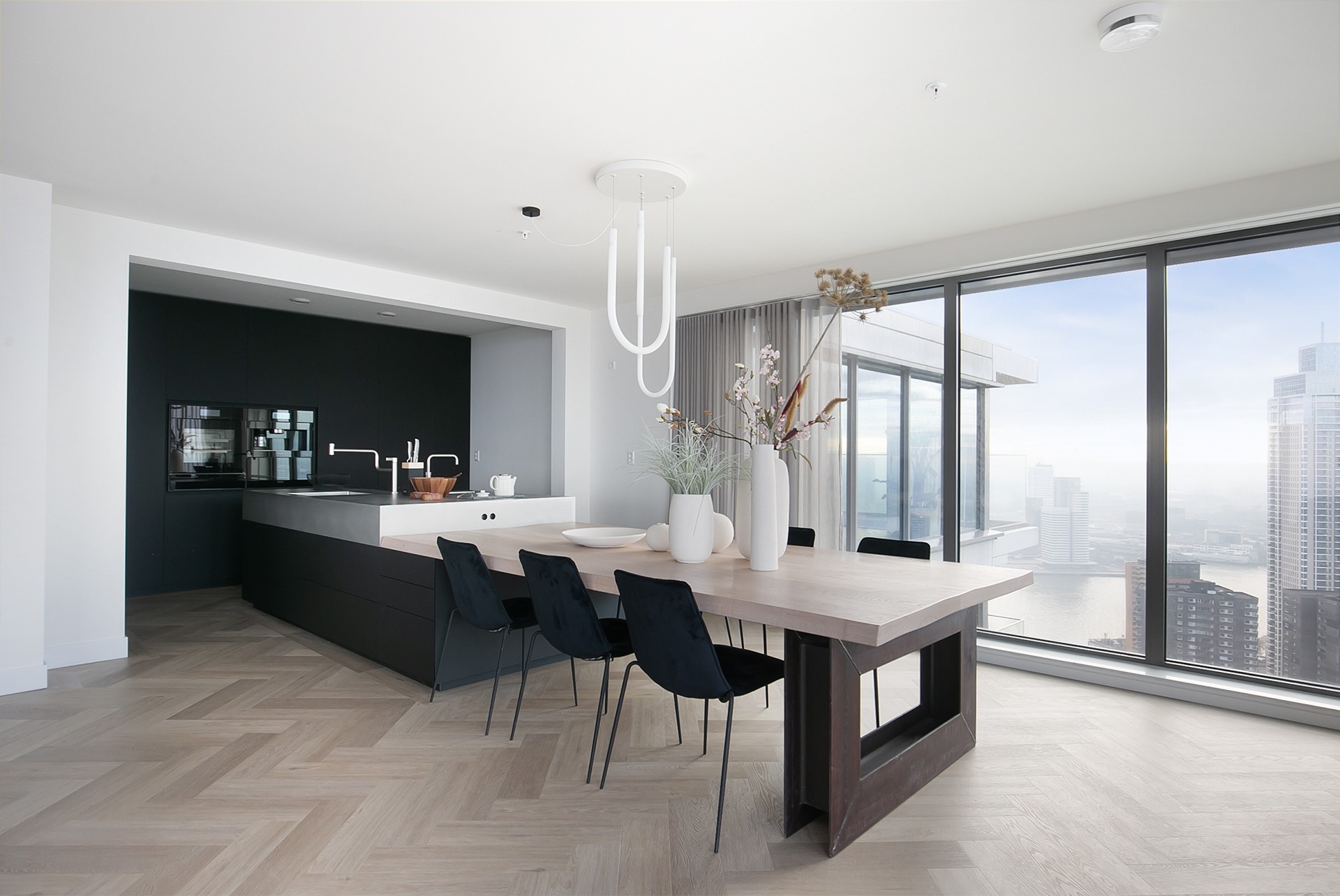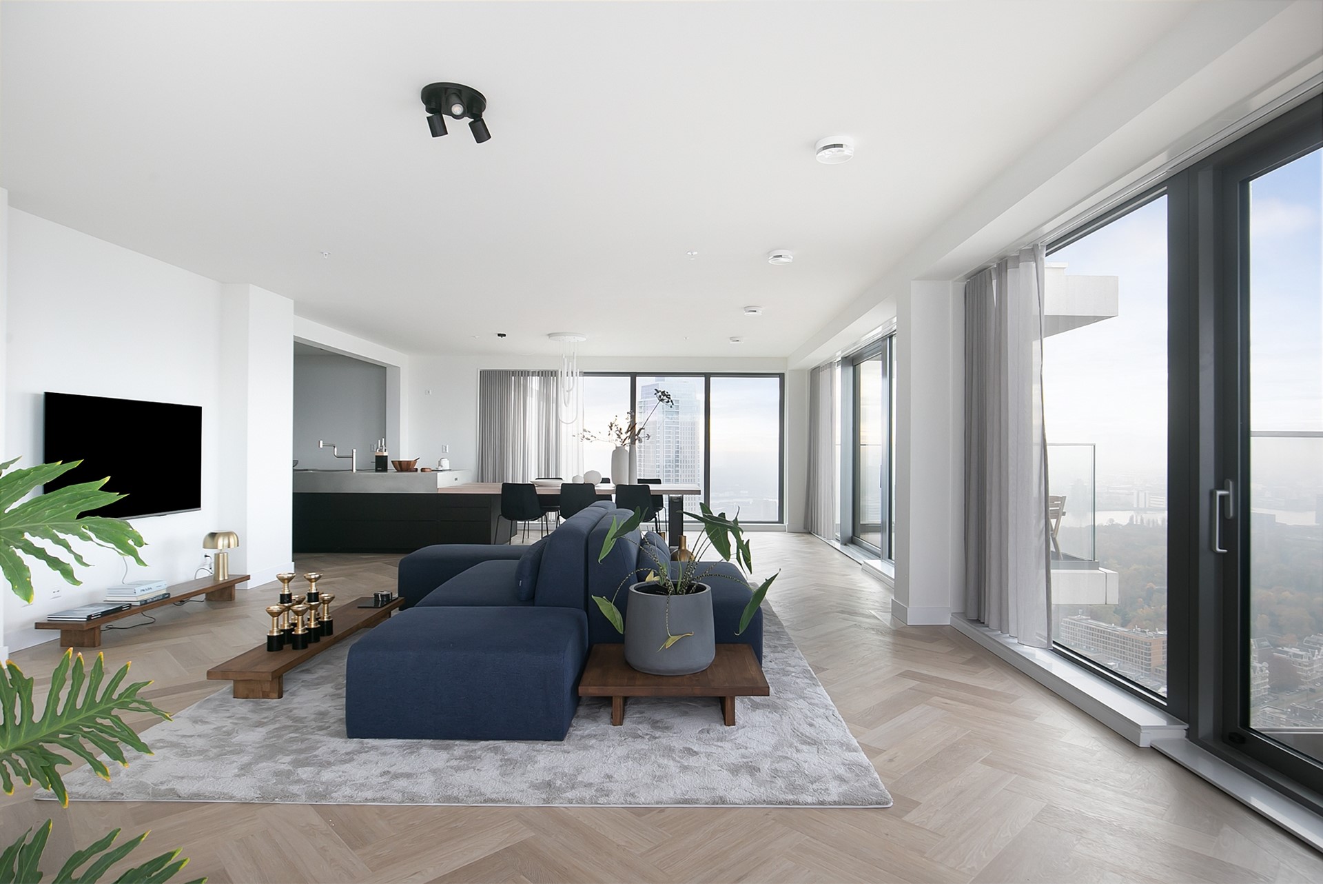 Aan de linkerzijde bevindt zich de indrukwekkende woon- en eetkamer, waar vloer-tot-plafond ramen een adembenemend panoramisch uitzicht bieden over Rotterdam, van Zuid tot Oost. De stijlvolle inrichting met meerdere zithoeken creëert een perfecte balans tussen comfort en elegantie.