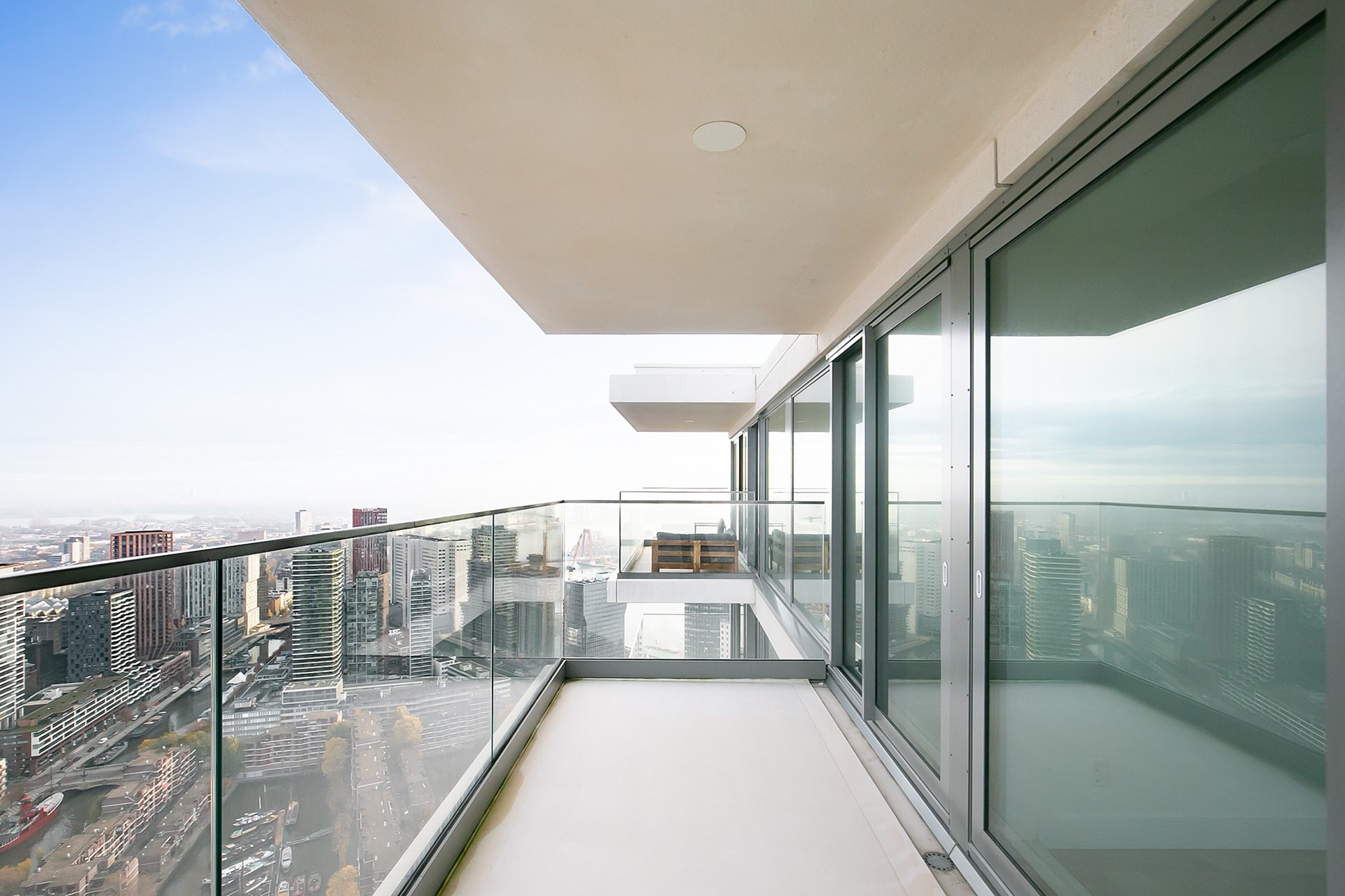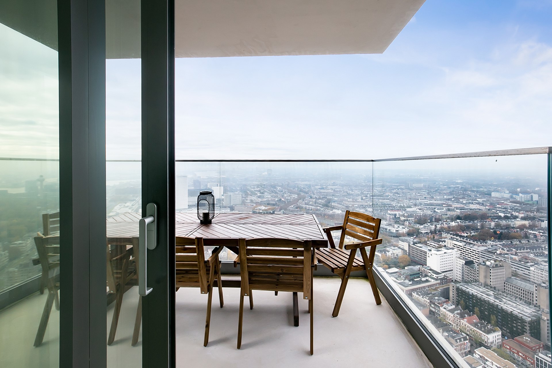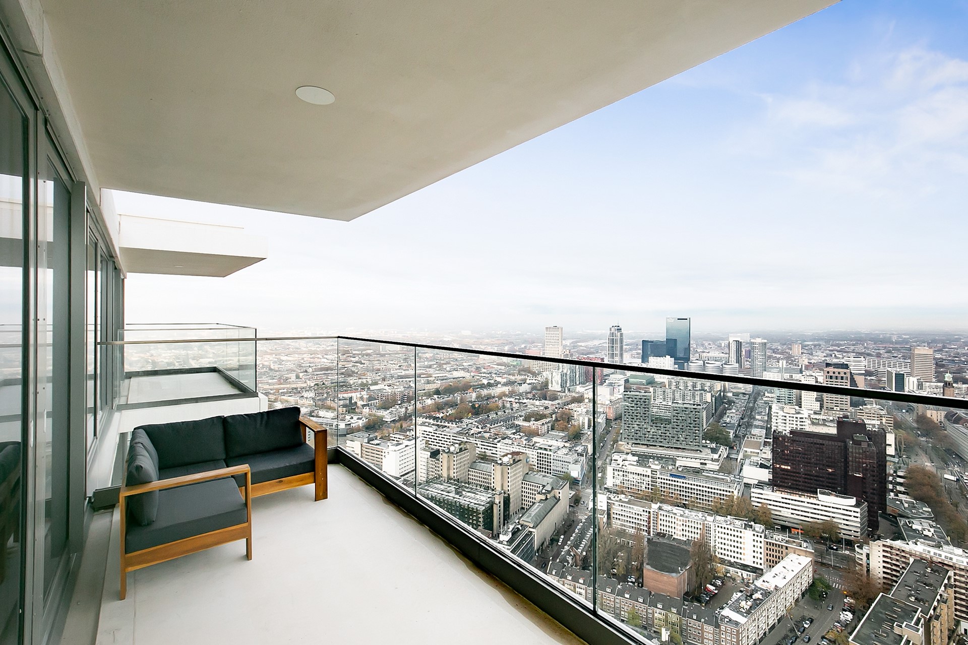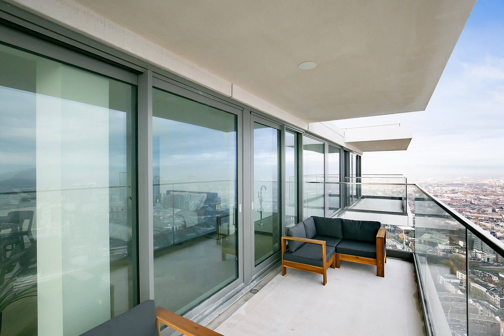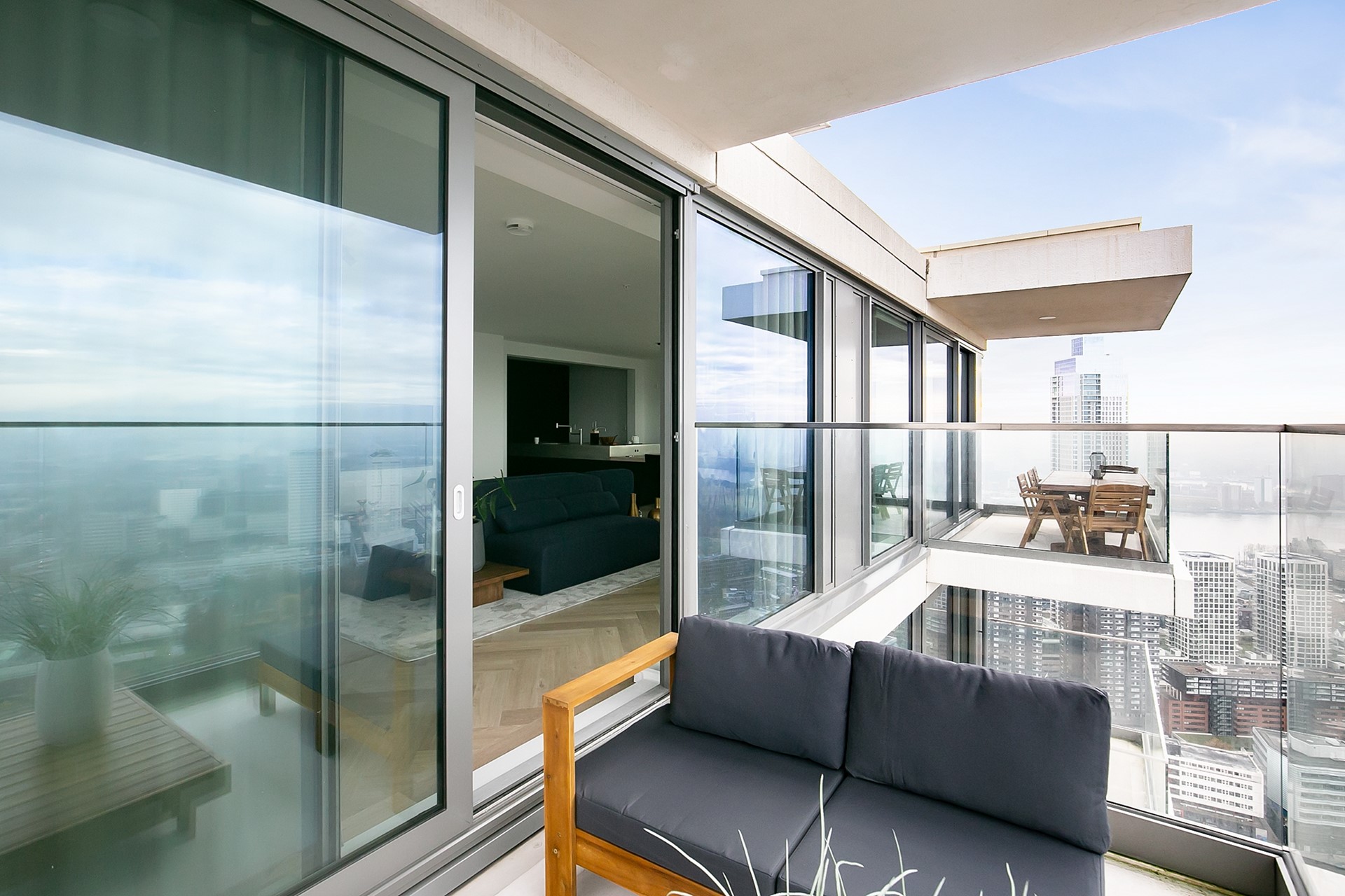 Vanuit de woonkamer heeft u toegang tot twee privébalkons; een unieke plek om de dag te beginnen of juist in alle rust af te sluiten, hoog boven de stad.