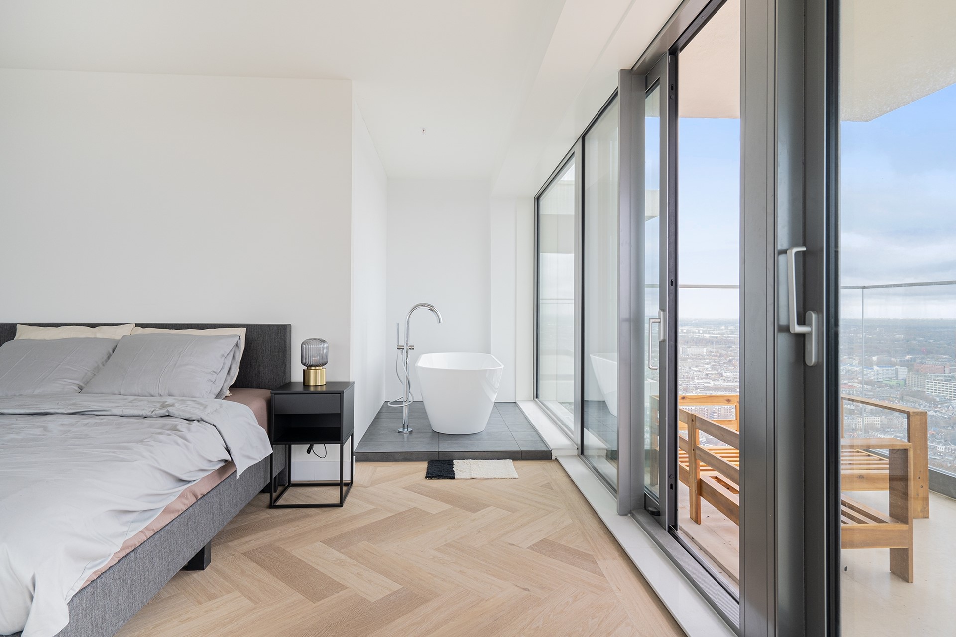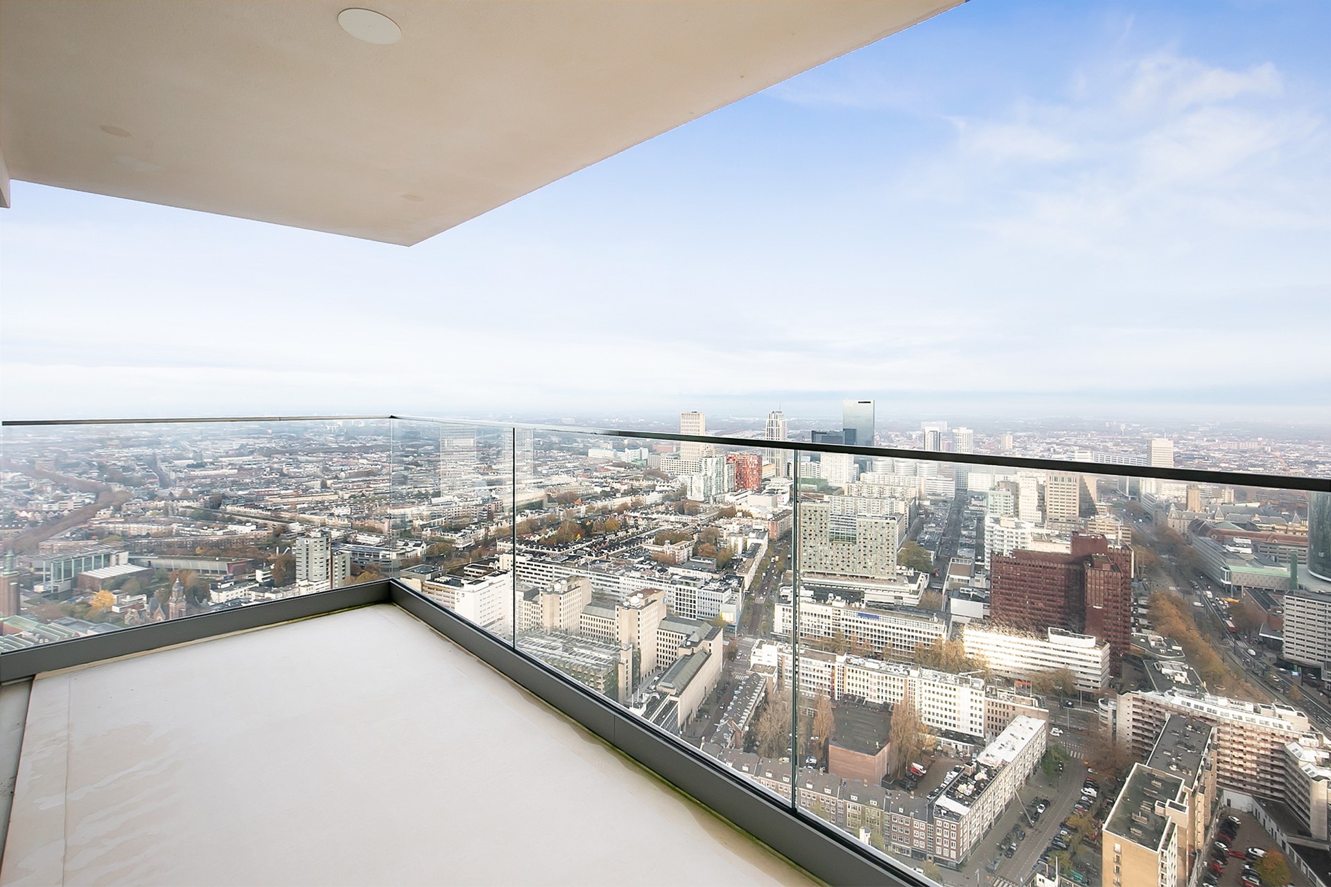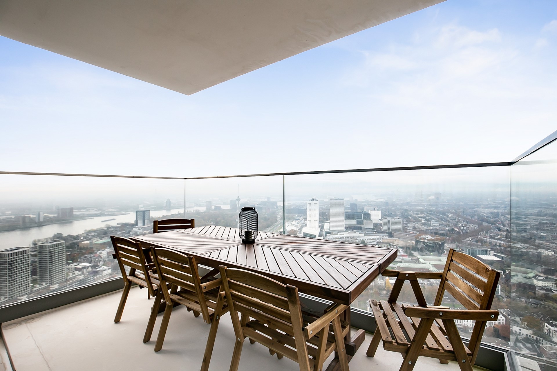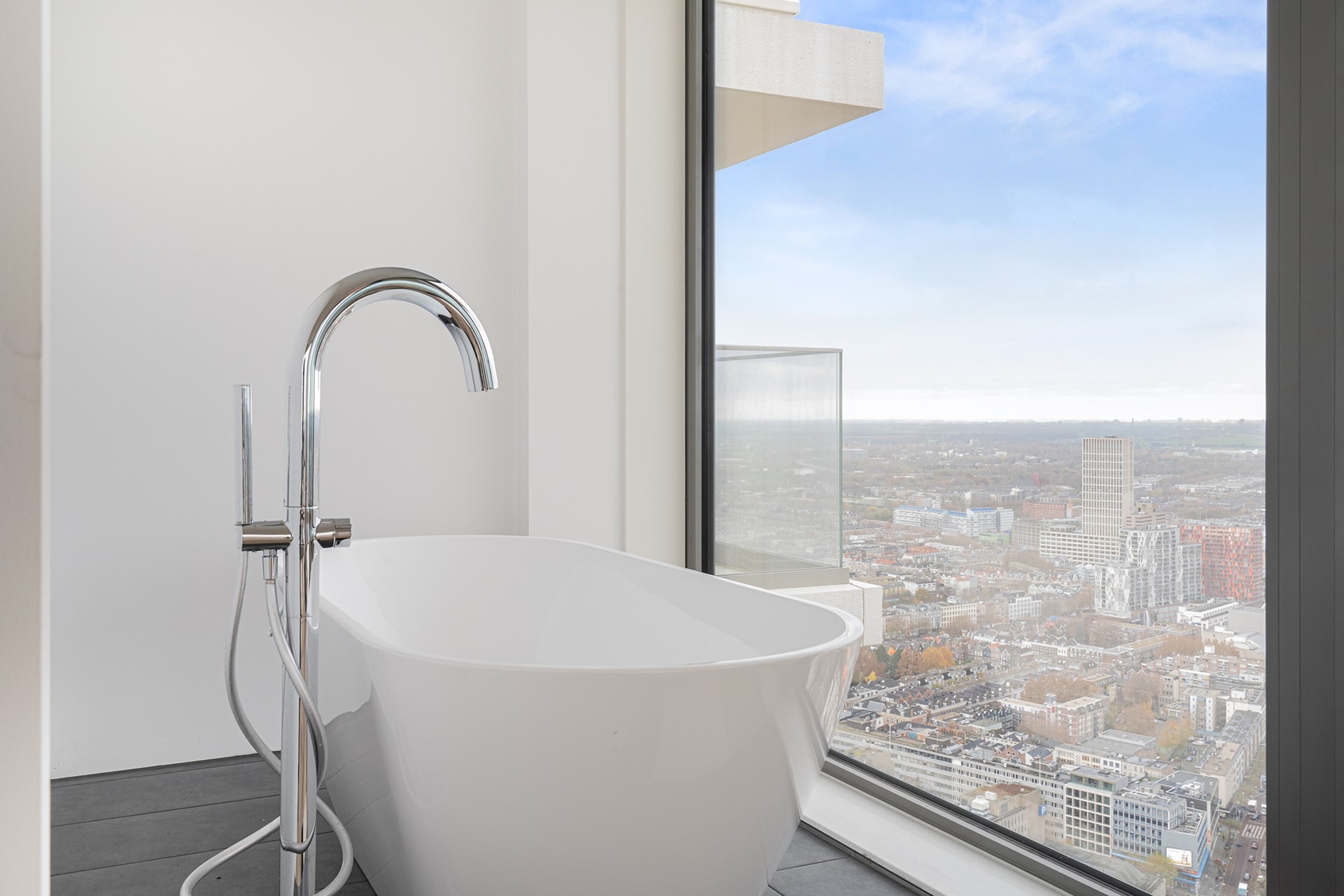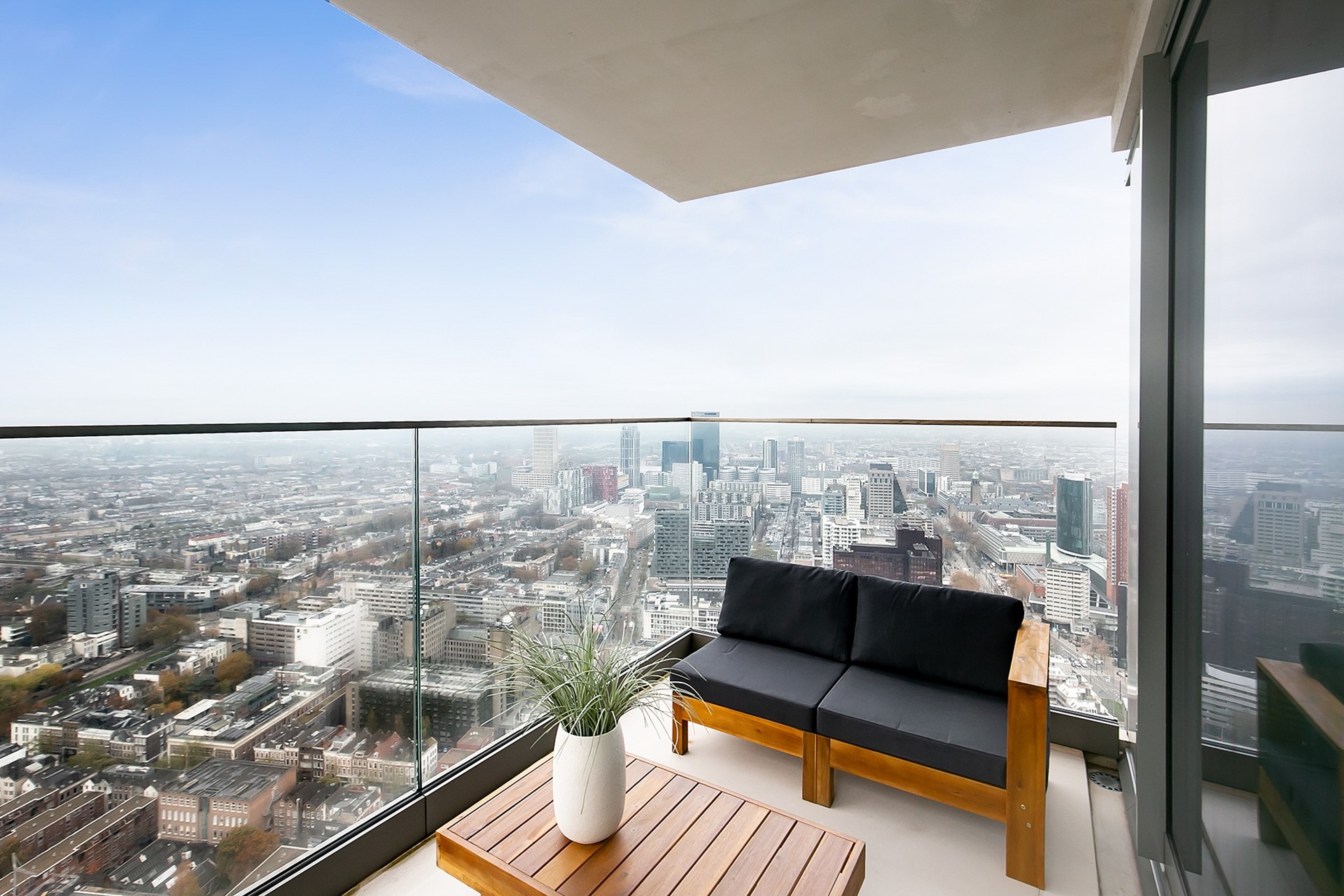 Vanuit de woonkamer heeft u toegang tot twee privébalkons; een unieke plek om de dag te beginnen of juist in alle rust af te sluiten, hoog boven de stad.