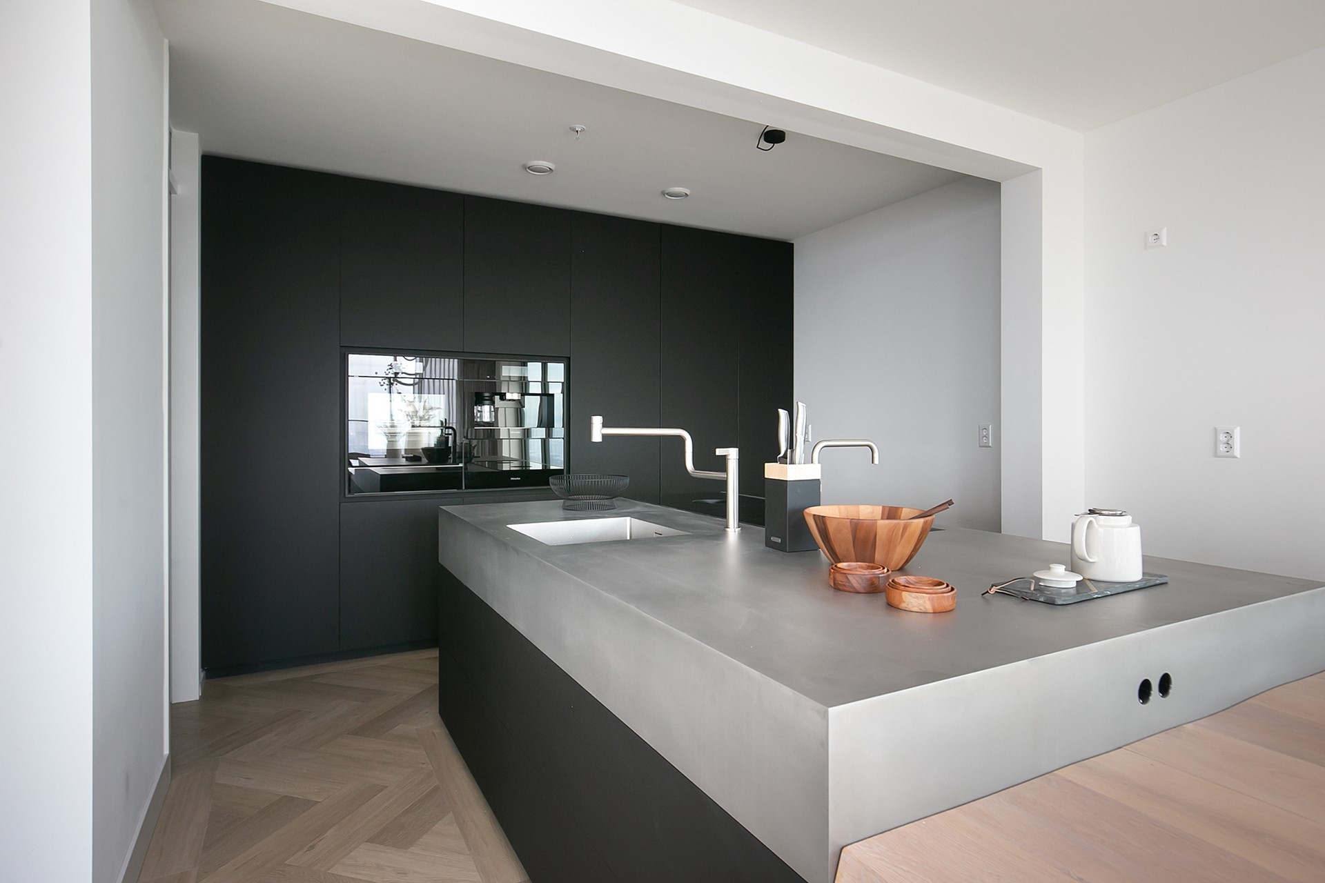 De luxe open keuken is ontworpen met oog voor detail en volledig uitgerust met hoogwaardige apparatuur: