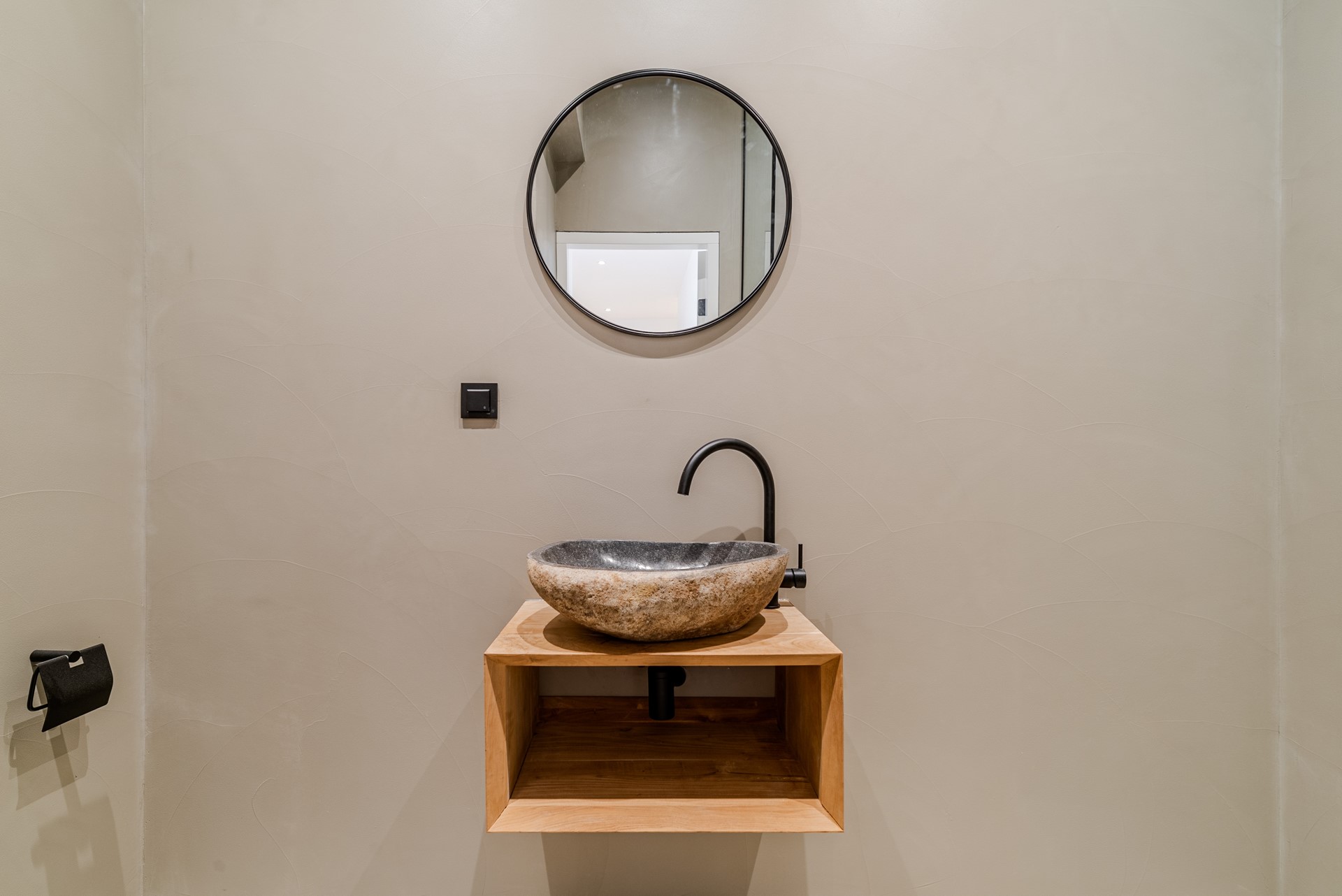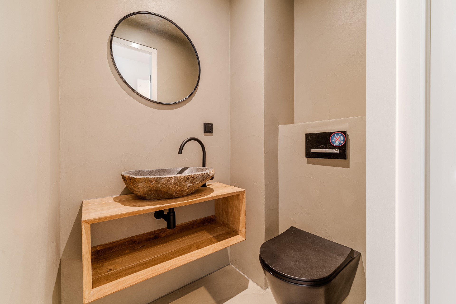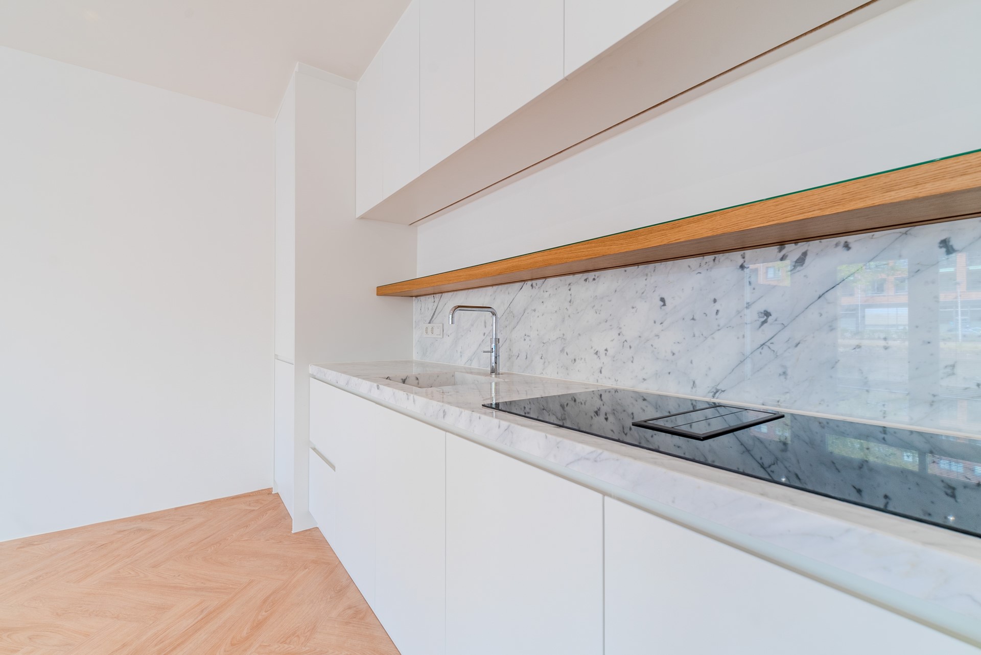 Een ruime woonkamer met grote ramen die zorgen voor veel natuurlijk licht. Aangrenzend bevindt zich de eetruimte naast een open keuken, uitgerust met moderne apparatuur, witte kasten en voldoende werkbladruimte. Op deze verdieping is ook een apart toilet met een moderne wastafel voor extra gemak.