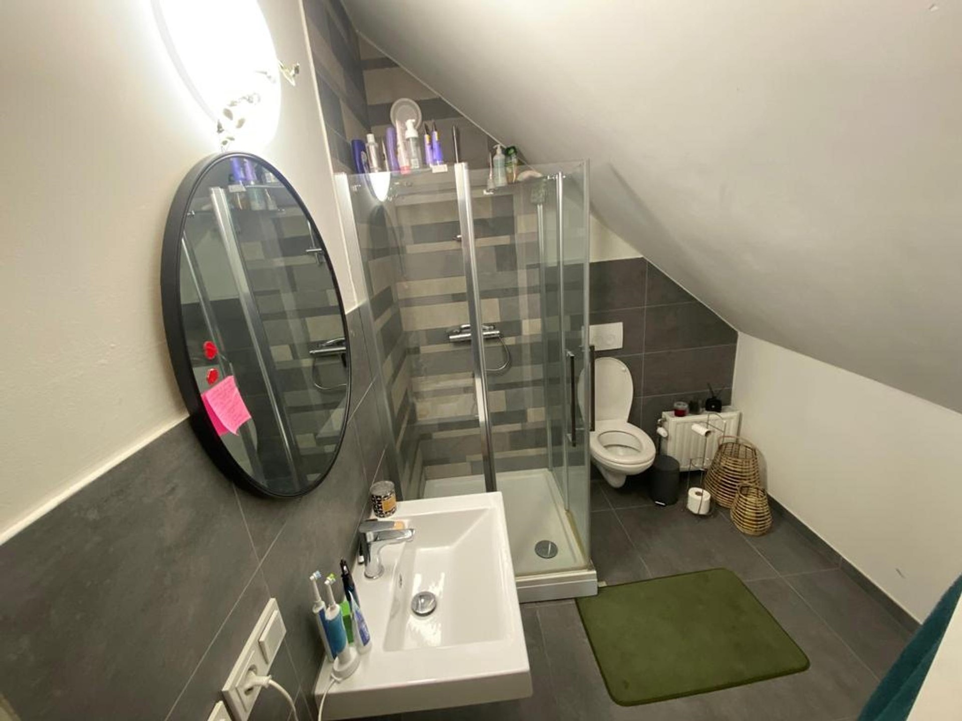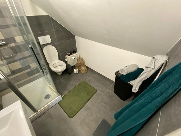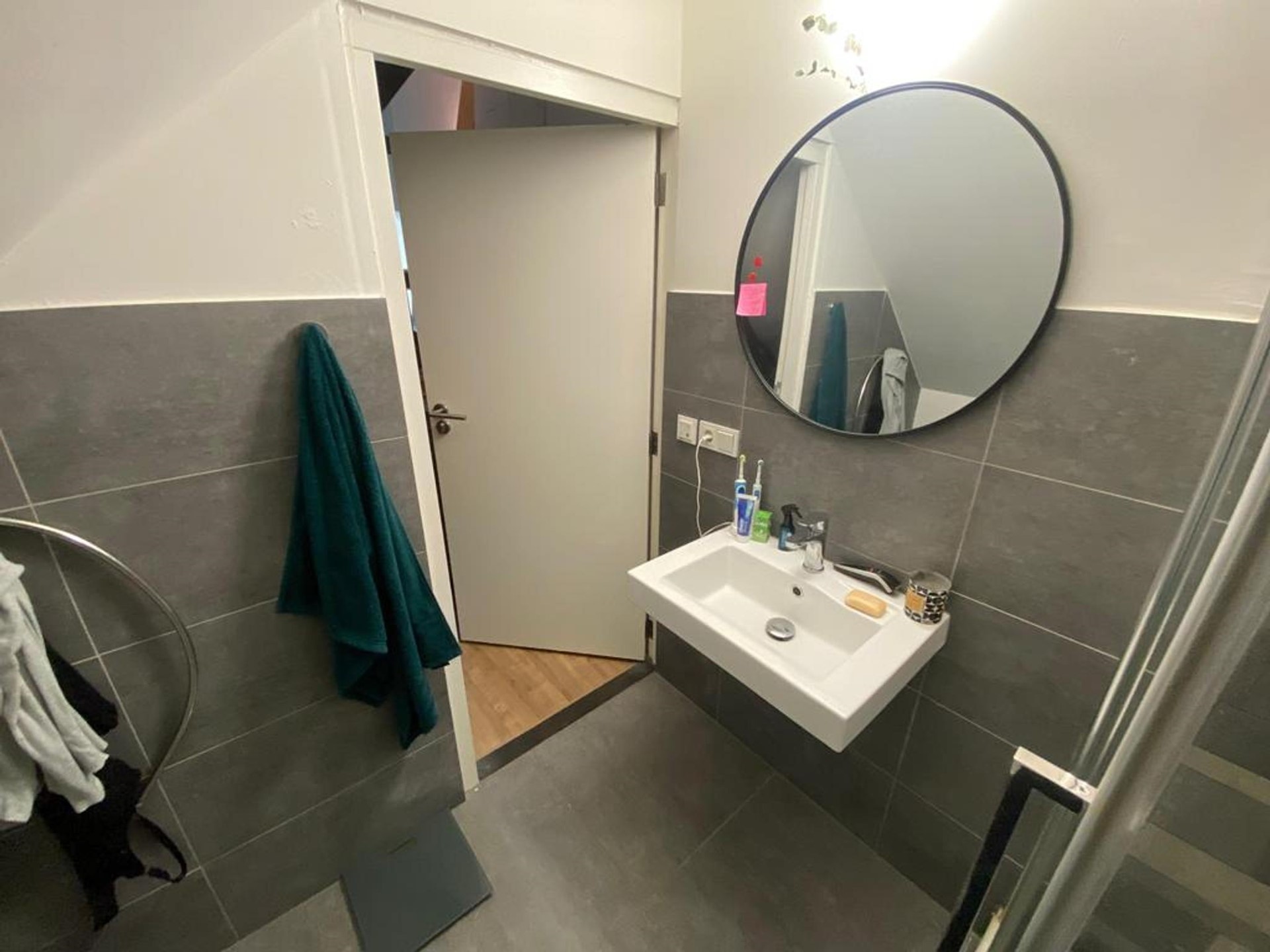 Apart is er een moderne badkamer met douchecabine, hangend toilet en aansluiting voor een wasmachine.
