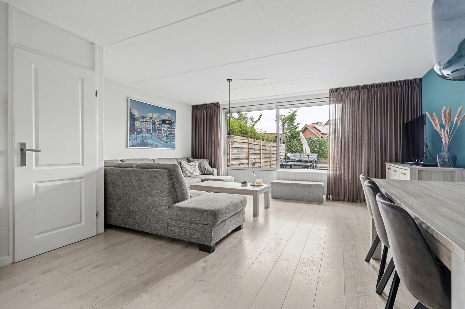 De indeling is als volgt: entree, hal met toilet, meterkast en trapopgang en aan linkerzijde de inpandige berging met toegang tot de aangebouwde garage. Aan rechterzijde de royale living van ca. 34 m² (781 x 520/420) met schuifpui naar de tuin, vaste kast onder de trap en de open keuken met hoekinbouwkeuken v.v. -apparatuur.