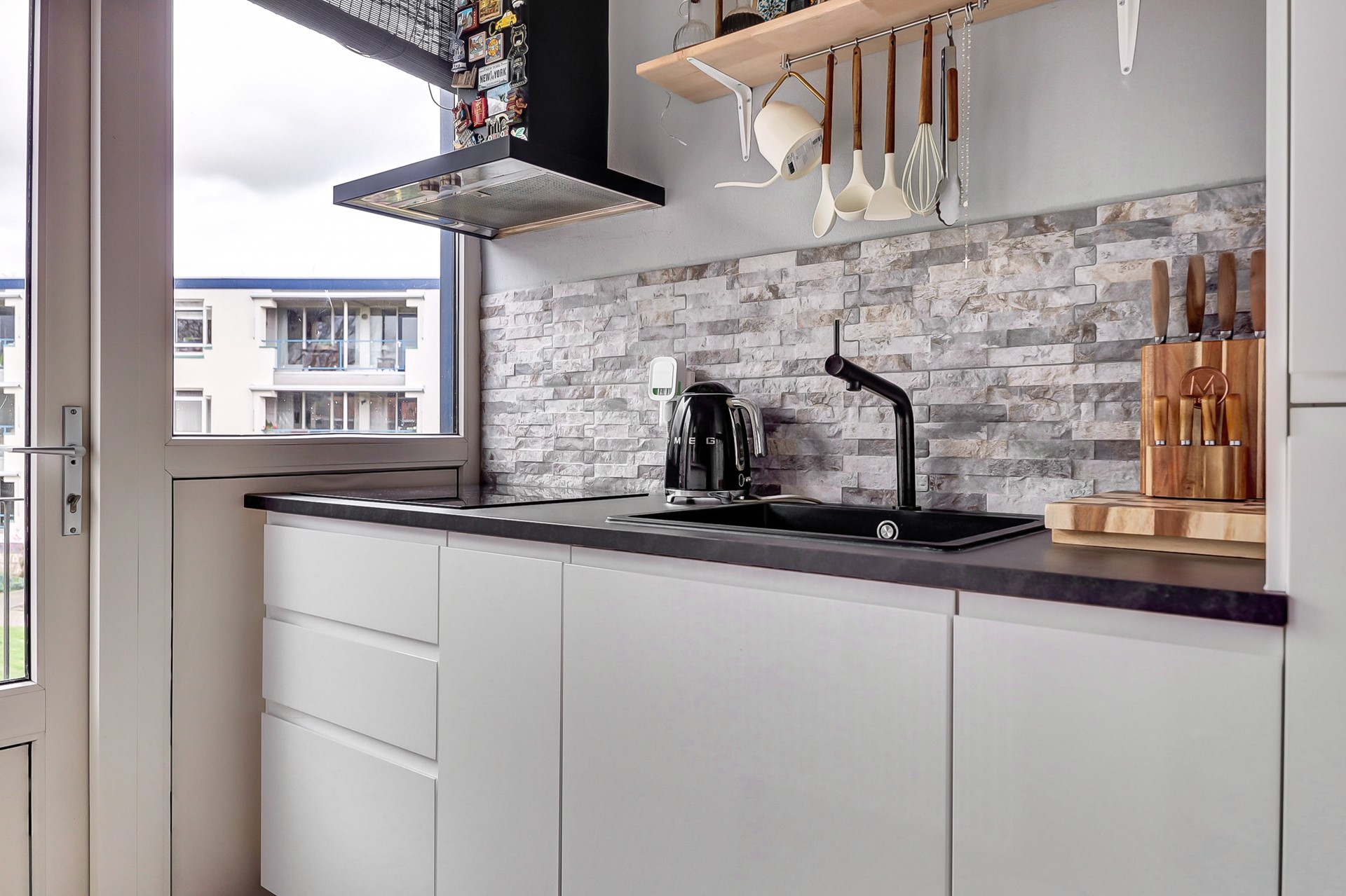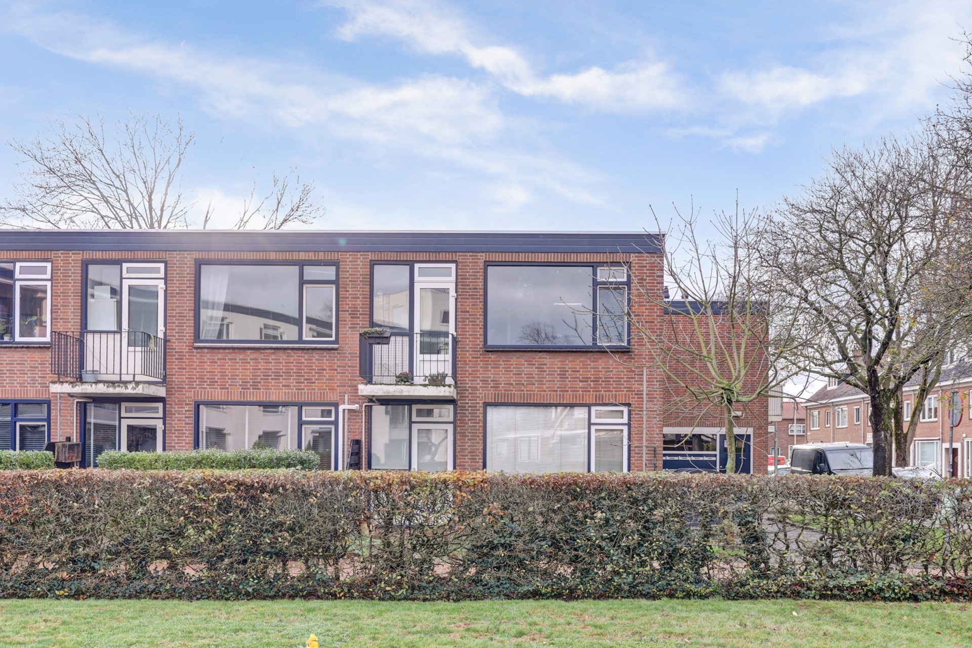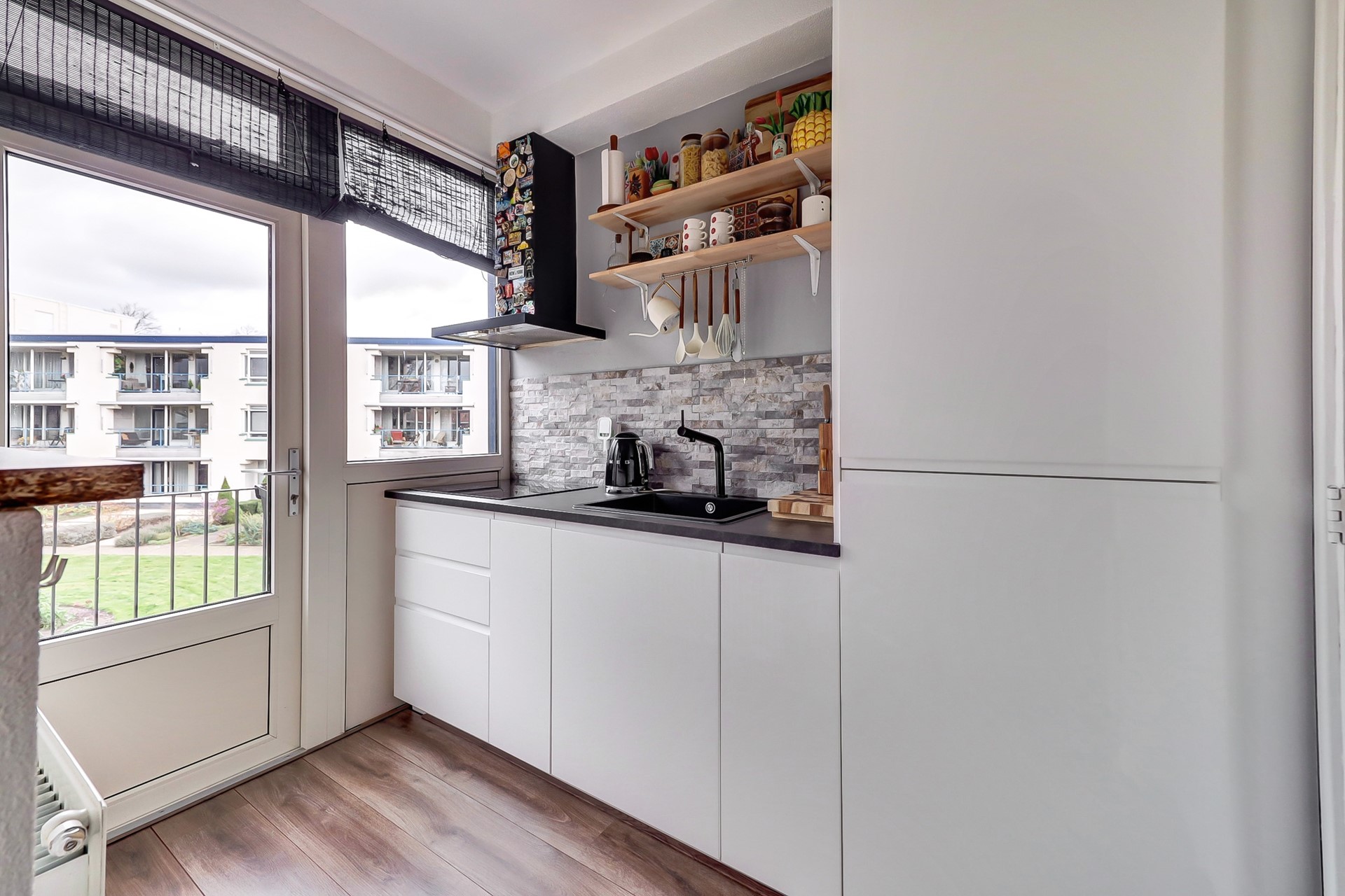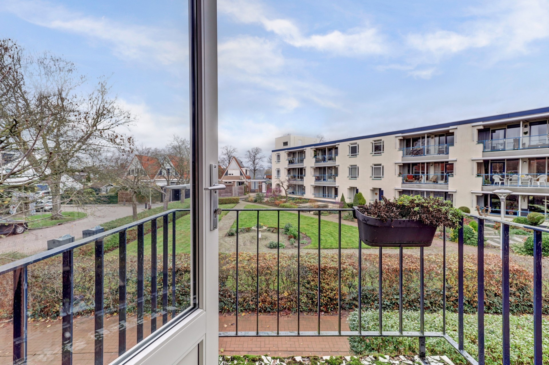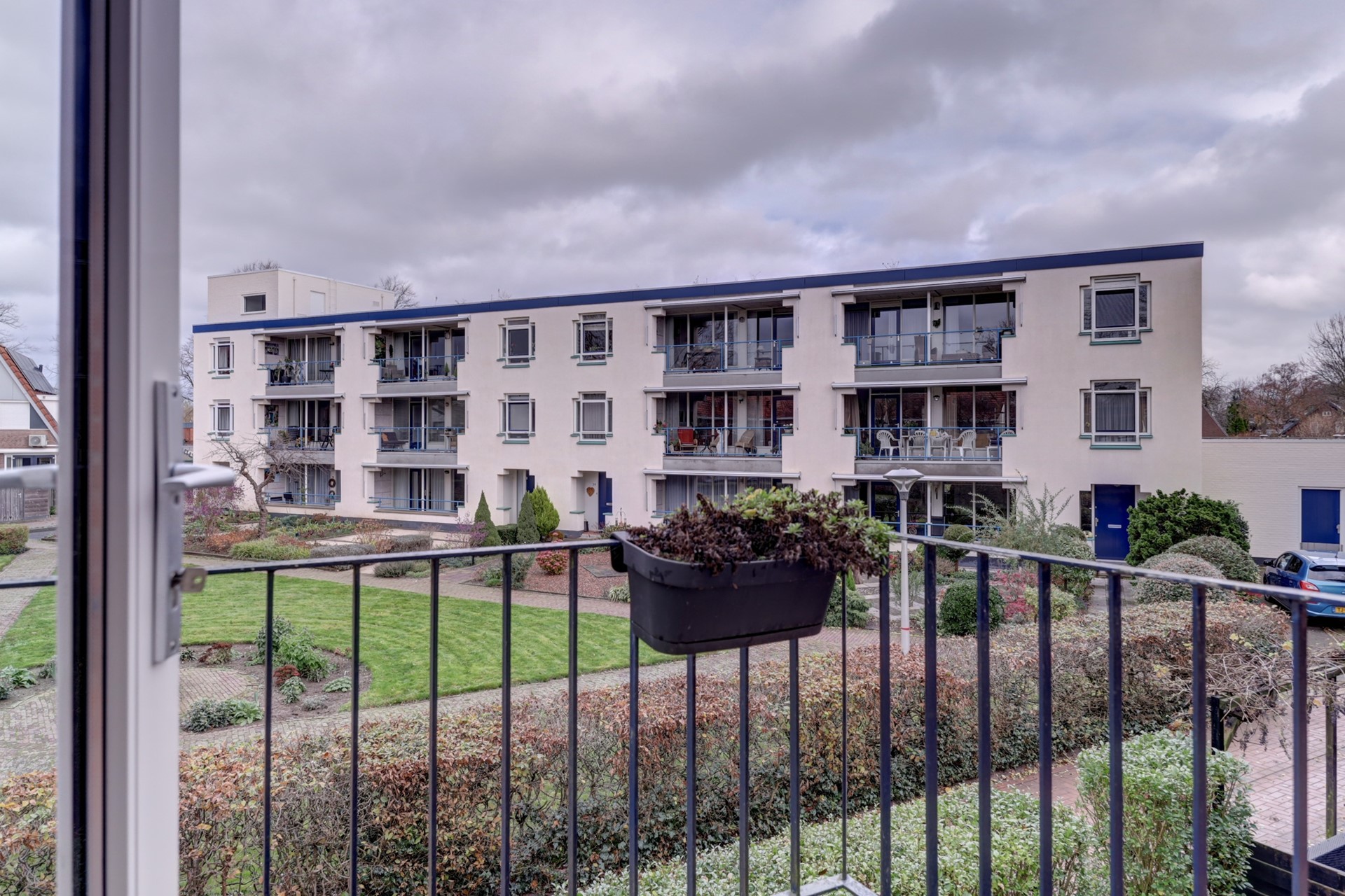 Instapklaar driekamer hoekappartement met balkon, berging en een aandeel in de grote gemeenschappelijke tuin.